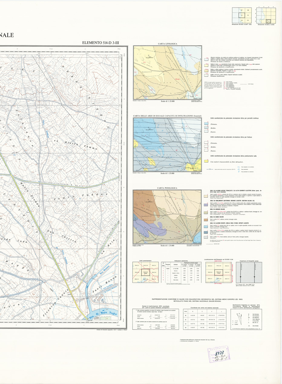 "Rappresentazione orografica a curve di livello, l'equidistanza fra le curve di livello: metri 5 per le curve a tratti metri 1. Altimetria espressa in metri e riferita al livello medio del mare (mareografo di Cagliari). Ripresa aerea, inquadramento geodetico e triangolazione aerea: I.G.M. restituzione aereofotogrammetrica, ricognizione e disegno: Aerofotogrammetria Ing. Barigazzi & C. s.n.c., Parma. Impianto cromo-fotolitografico: Ordis, Piacenza. Stampa: Pubbligraf, Napoli."