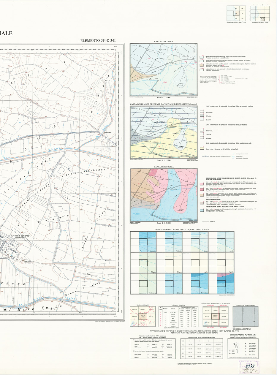 "Rappresentazione orografica a curve di livello, l'equidistanza fra le curve di livello: metri 5 per le curve a tratti metri 1. Altimetria espressa in metri e riferita al livello medio del mare (mareografo di Cagliari). Ripresa aerea, inquadramento geodetico e triangolazione aerea: I.G.M. restituzione aereofotogrammetrica, ricognizione e disegno: Aerofotogrammetria Ing. Barigazzi & C. s.n.c., Parma. Impianto cromo-fotolitografico: Ordis, Piacenza. Stampa: Pubbligraf, Napoli."