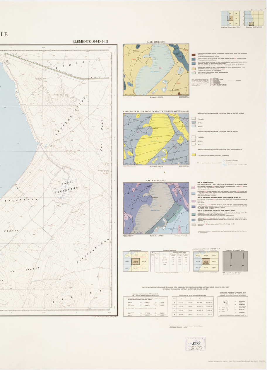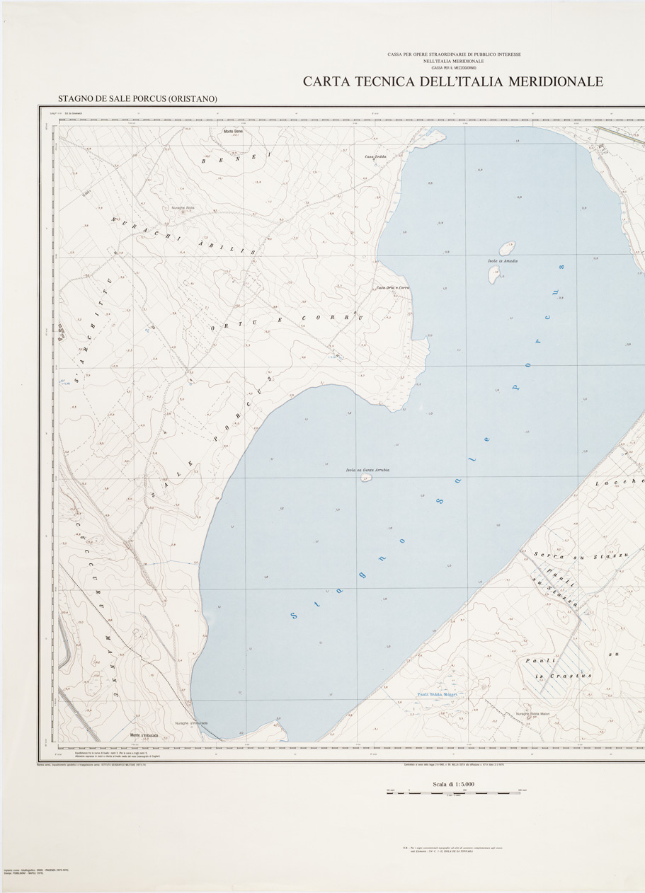 "Rappresentazione orografica a curve di livello, l'equidistanza fra le curve di livello: metri 5 per le curve a tratti metri 1. Altimetria espressa in metri e riferita al livello medio del mare (mareografo di Cagliari). Ripresa aerea, inquadramento geodetico e triangolazione aerea: I.G.M. (FI). Impianto cromo-fotolitografico: Ordis, Piacenza. Stampa: Pubbligraf, Napoli."