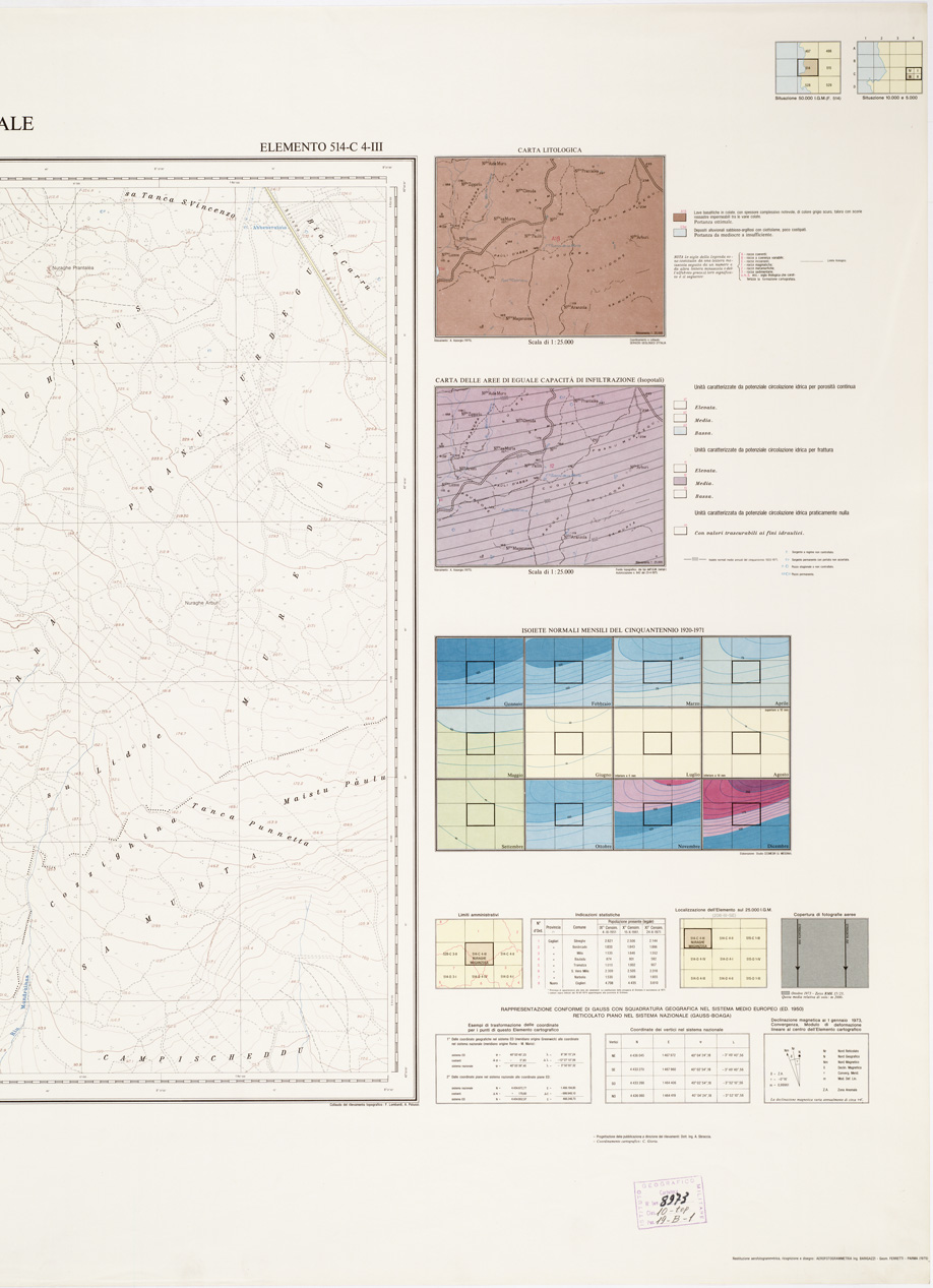 "Rappresentazione orografica a curve di livello, l'equidistanza fra le curve di livello: metri 5 per le curve a tratti metri 1. Altimetria espressa in metri e riferita al livello medio del mare (mareografo di Cagliari). Ripresa aerea, inquadramento geodetico e triangolazione aerea: I.G.M. (FI). Impianto cromo-fotolitografico: Ordis, Piacenza. Stampa: Pubbligraf, Napoli."