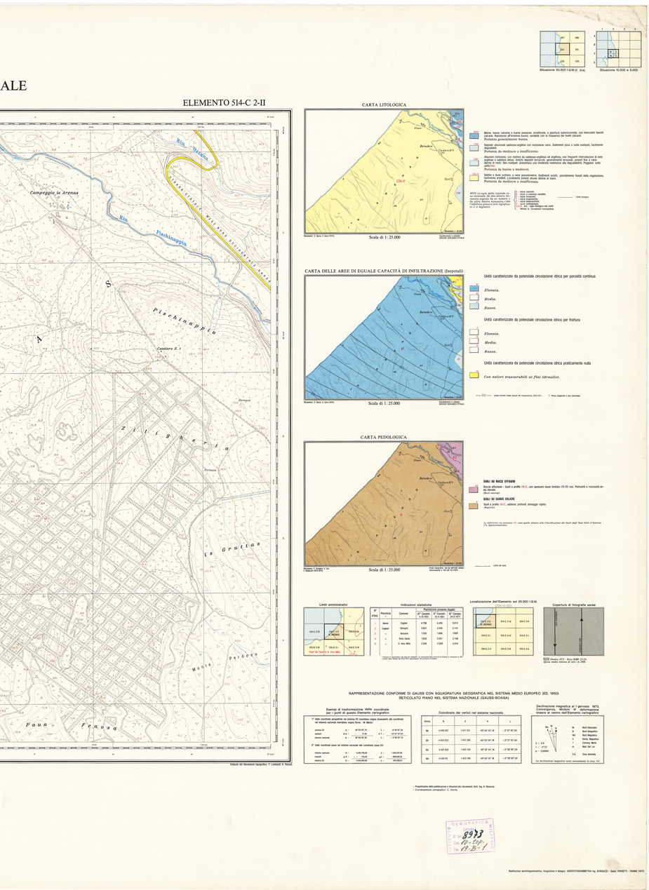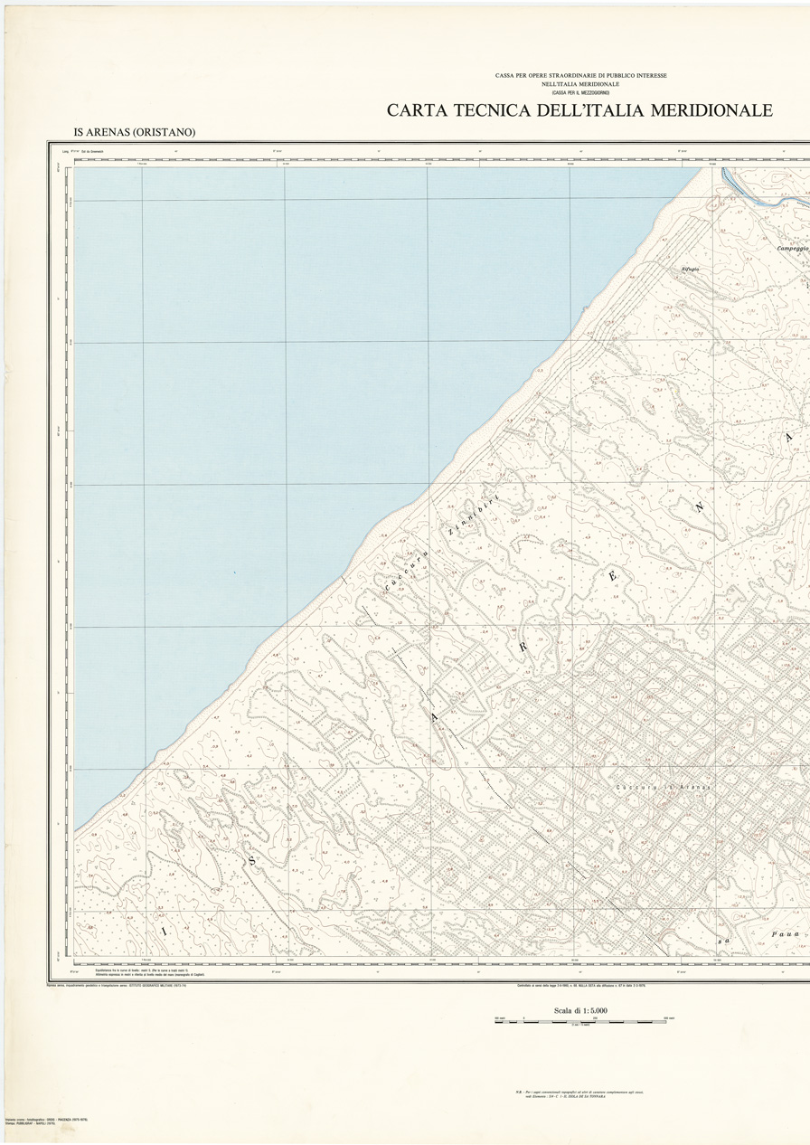 "Rappresentazione orografica a curve di livello, l'equidistanza fra le curve di livello: metri 5 per le curve a tratti metri 1. Altimetria espressa in metri e riferita al livello medio del mare (mareografo di Cagliari). Ripresa aerea, inquadramento geodetico e triangolazione aerea: I.G.M. (FI). Impianto cromo-fotolitografico: Ordis, Piacenza. Stampa: Pubbligraf, Napoli."