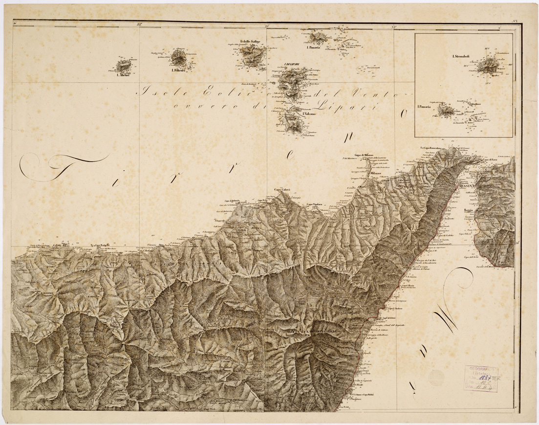 "...COMPILATA SUI MIGLIORI DOCUMENTI ESISTENTI. TORINO 1860. Ristampa del 1860. Carta in quattro fogli incisi su rame pubblicata dall'Officio Topografico di Napoli dopo che, perduti i rami della edizione rinnovata del 1809-10 della carta dello Schmettau (v. n. 7 d'ordine Cart. n. 97, Docum. n. 1) durante i moti del 1820, venne decisa questa nuova edizione per la quale vennero impiegati anche i nuovi rilievi idrografici compiuti dal Capitano Smyth incaricato dall'Ammiragliato Britannico. La carta mostra il rilievo orografico mediante tratteggio a luce obliqua distingue gli abitati secondo la loro importanza amministrativa, gli arcivescovadi, i vescovadi, i confini di valle, di distretto, di circondario, il telegrafo, le torri di segnale, i castelli, i molini le strade sono classificate in rotabili, per cavalli e sentieri: gli scandagli sono espressi in tese e piedi parigini. Due copie una delle quali in fogli montati su tela a stacchi, con aggiunti a mano i confini delle "valli" a colore verde e il tracciato delle strade carrozzabili in costruzione in rosso l'altra evidentemente una ristampa posteriore al 1860, con aggiunte le ferrovie in esercizio. Cfr. la stessa carta del 1860 ai numeri di files B0005335-38, ele carte da cui deriva corrispondenti ai files B0005160-63 (1826), B0005164-67 (1826), B0005168-71 (1860). In appartenenza alla Biblioteca e all'Archivio sono una serie di carte sull'Isola di Sicilia pubblicate in anni diversi ma collegate fra loro. Questo il quadro riassuntivo di tali documenti: N° 7 d'ordine - Cart. d'Arch. 92 Docum. 1- anno 1809-10 - N° 11 d'ordine - Inv. gen. 1735 bis - Files B0005160-63 - anno 1826 - copia su tela - Inv. gen. 1887 - Files B0005164-67 - anno 1826 - Inv. gen. 1887 ter - Files B0005172-75 - anno 1860 N° 17 d'ordine - Inv. gen. 1735 - anno 1826 - - Inv. gen. 1887 bis - Files B0005168-71 - anno 1860 N° 18 d'ordine - Inv. gen. 1766 - Files B0005335-38 - anno 1860"