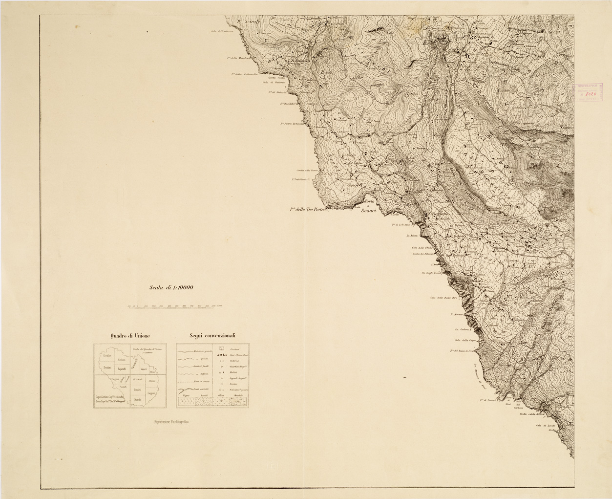 "...RILEVATA E DISEGNATA DAGLI ALLIEVI DELL'ISTITUTO TOPOGRAFICO MILITARE ALLA SCALA DI 1:10.000 NELL'ANNO 1877. Riproduzione fotolitografica della carta, in quattro fogli, alla Cartella d'Archivio n. 95 - Documento n. 29 - Categ. 9391 - Consultabile ai numeri di Files A0002715-18. La stessa riproduzione fotolitografica è in appartenenza anche all'Archivio Topocartografico (Cartella d'Archivio n. 95 - Documento n. 29 - Categ. 9391 - cfr. i Files A0002719-26). Questa la descrizione della carta d'Archivio in quattro fogli. "Quattro fogli, montati su cartone. Sono i rilevamenti originali eseguiti sotto la direzione del Cap. di Stato Maggiore C. Canna, disegnati a colore, riuniti a mosaico, pronti per la riproduzione fotolitografica. L'orografia è rappresentata mediante curve di livello tracciate all'equidistanza di m. 25 in bistro e tratteggio (rocce), gli abitati sono in rosso, le acque sono in azzurro, le strade sono classificate in mulattiere grandi e piccole, sentieri facili e difficili: sono inoltre indicati i muri a secco, fossi asciutti, cimiteri, case, chiese, croci, cisterne, giardini d'agrumi, molini, rovine, abitazioni preistoriche, i segnali trigonometrici, i vigneti, i boschi, gli olivi, le macchie. Il foglio sud-occidentale contiene la legenda dei segni convenzionali e il quadro d'unione con i nomi degli ufficiali che presero parte al lavoro". Sempre in appartenenza alla Biblioteca un'altra copia fotolitografica in quattro fogli in bianco e nero - numero d'Inv. 8020 - Files B0005180-83."