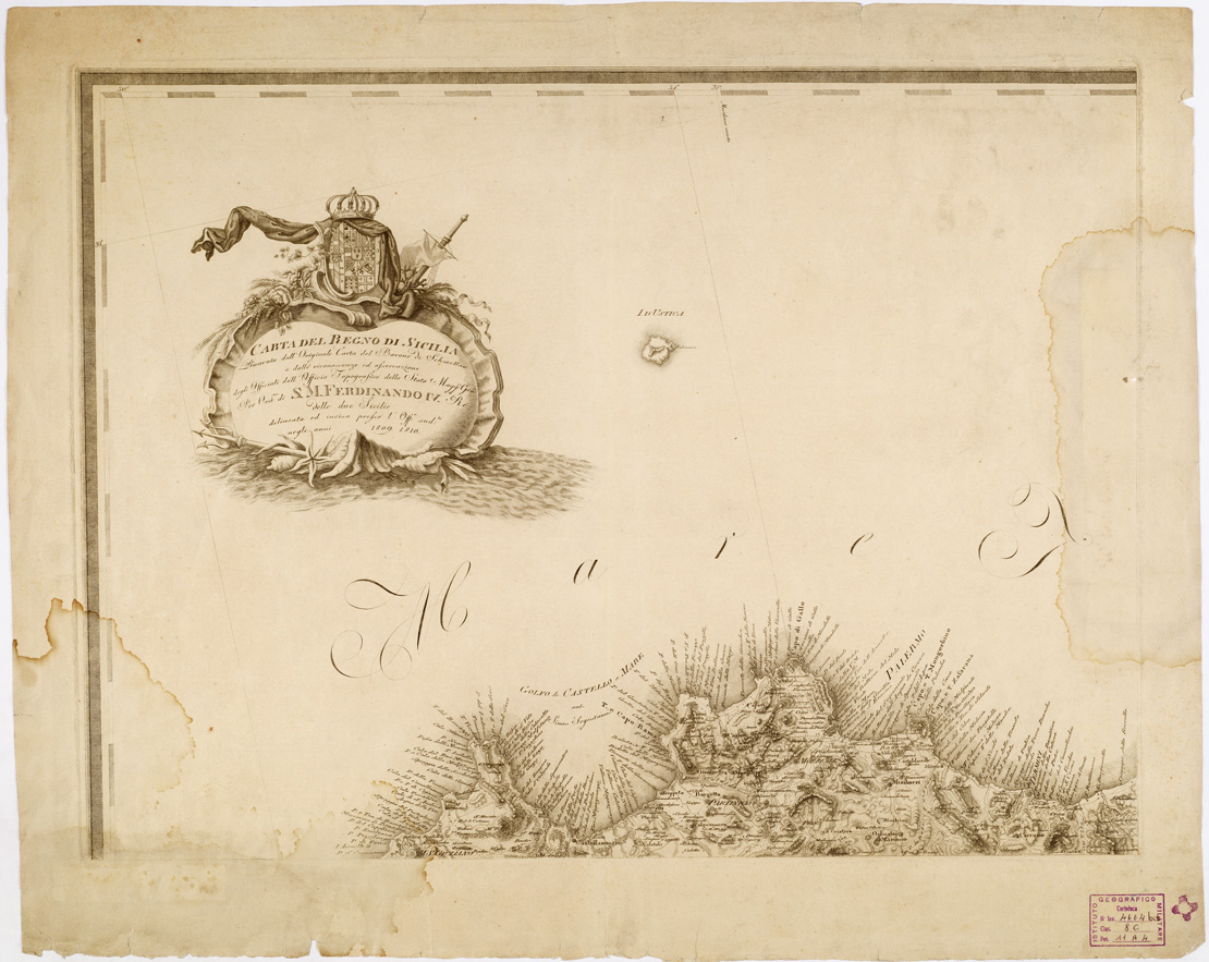 "RICAVATA DALL'ORIGINALE CARTA DEL BARONE DI SCHMETTAU E DALLE RICONOSCENZE ED OSSERVAZIONI DEGLI OFFICIALI DELL'OFFICIO TOPOGRAFICO DELLO STATO MAGG.RE GEN.LE PER ORDINE DI S. M. FERDINANDO IV RE DELLE DUE SICILIE DELINEATA ED INCISA PRESSO L'OFF. SUD.TO NEGLI ANNI 1809-1810. Carta in quattro fogli riuniti e montati su tela finemente incisa, basata su la revisione di quella dello Schmettau (v. n. 5 d'ordine, Cart. d'Arch. n. 97, n. d'Arch. 9092). Le ricognizioni tuttavia, eseguite con strumenti insufficienti, consentirono un miglioramento dell'originale, ma non permisero la creazione di una carta che rispondesse veramente alle nuove esigenze di esattezza. (Cfr. MORI A., La cartografia ufficiale in Italia e l'I.G.M., 1922). La copia posseduta reca tracciati a mano i confini a colori di 23 comarche: si suppone che possa trattarsi della delimitazione originale eseguita nel 1812 dal Canonico Piazzi per ordine del Governo della Sicilia. Confronta anche: col numero d'invent. 4664 la carta col medesimo titolo ai files B0012905-08 e al numero d'inv. 4664 ter. i files B0005202-03."