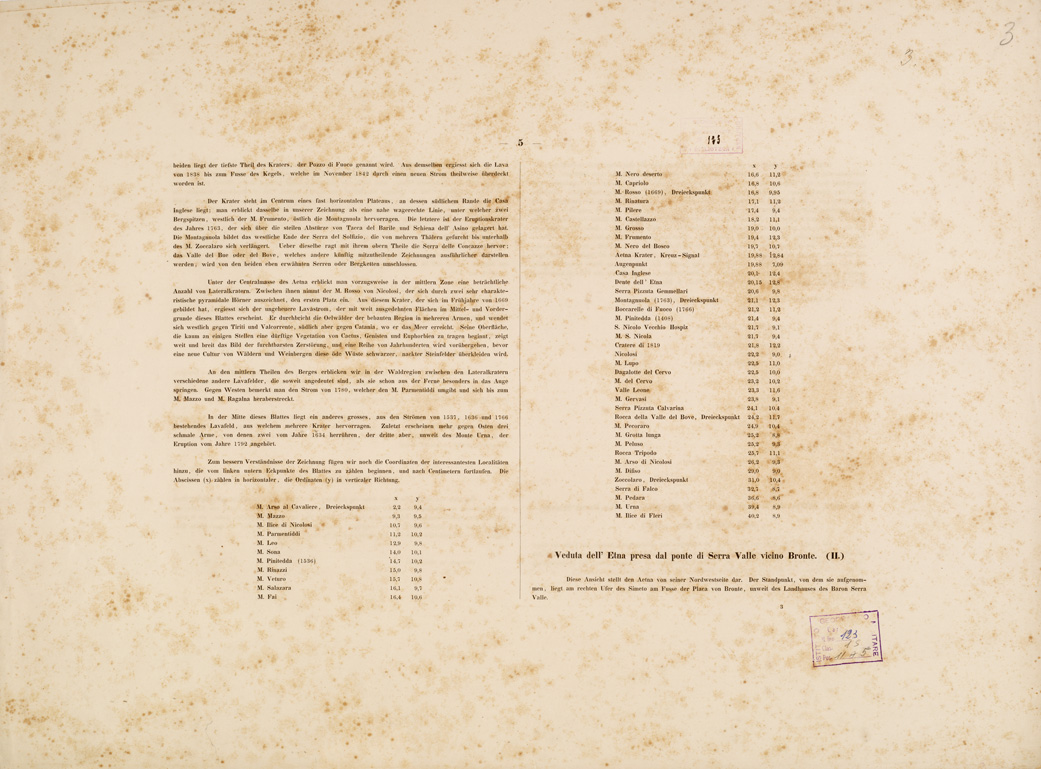 "I....PER IL BARONE SARTORIUS DI WALTERSHAUSEN COLL'ASSISTENZA DI SAV. CAVALLARI, C. F. PETERS E C. ROOS. ESEGUITA IN SICILIA DAL 1836 AL 1843. SAV. CAVALLARI SCUPLS. GOTTINGA 1844. CARATTERE DI G. SIEDENTOFF, FRANCOFORTE, S. M.. II....PER IL BARONE SARTORIUS DI WALTERSHAUSEN COLL'ASSISTENZA DI SAV. CAVALLARI, C. F. PETERS E C. ROOS ESEGUITA IN SICILIA DAL 1836 AL 1843. SAV. CAVALLARI E J. HEY SC. CARATTERE DI J. SIEDENTOFF. FRANCOFORTE S. M.. La carta si compone di 13 fogli tratti da incisione su rame, editi in Berlino da Simon Shropp dal 1844 al 1857. I titoli sono: I, Maletto II, Mojo III, Linguagrossa IV, Bronte V, Cratere VI, Giarre VII, Adernò VIII, Nicolosi IX, Aci-Reale X, Paternò XI, Catania XII, Aci Castello XIII, F. Simeto. Il foglio n. 12 contiene il titolo il foglio n. 13 della edizione geologica reca la leggenda dei colori adottati per la dimostrazione delle lave e dei terreni. Sono distinti: lave senza epoca, del Medio Evo, moderne, formazione centrale, basalto, crateri, tuffo vulcanico, jurassico, cretaceo inferiore, arenaria, conglomerati, terziario creta, terziario arene e ciottoli, gesso, alluvio. Il lavoro topografico è poggiato sui lavori trigonometrici condotti dall'A. e dal dott. Peters di Flensburg. La rete trigonometrica, derivata da una base misurata tra Portella e Gurna (Riposto) nel 1836 dal prof. Listing, venne estesa a coprire l'intero monte dell'Etna. Nel disegno topografico l'A. venne coadiuvato da C. Roos di Magonza e S. Cavallari di Palermo. Il disegno originale della carta venne eseguito in Sicilia alla scala di 1:30.000 in 100 fogli delle dimensioni ognuno di cm. 16x133 e fu ridotto quindi, per la pubblicazione, alla scala di 1:50.000. L'orografia vi è rappresentata con fine tratteggio. La carta si estende dalla foce del Simeto al cratere di Moyo (58.000 metri) e dal Capo di S. Andrea (Taormina) al Monte di Bolo (48.000 metri). Comprende quindi tutto il terreno lavico dell'Etna e le formazioni nettuniche viciniore. Alla carta sulla quale trovansi registrati tutti i materiali necessari per una completa conoscenza dell'Etna fino al 1842, va unito un testo in 21 fogli di grande formato che illustra le colate delle lave e ne fissa l'epoca contiene inoltre le coordinate dei punti trigonometrici determinati e 31 tavole incise su rame con vedute, profili e sezioni, queste ultime a colori."