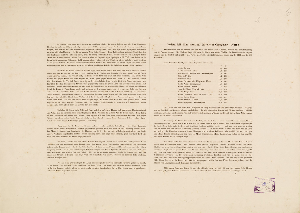 "I....PER IL BARONE SARTORIUS DI WALTERSHAUSEN COLL'ASSISTENZA DI SAV. CAVALLARI, C. F. PETERS E C. ROOS. ESEGUITA IN SICILIA DAL 1836 AL 1843. SAV. CAVALLARI SCUPLS. GOTTINGA 1844. CARATTERE DI G. SIEDENTOFF, FRANCOFORTE, S. M.. II....PER IL BARONE SARTORIUS DI WALTERSHAUSEN COLL'ASSISTENZA DI SAV. CAVALLARI, C. F. PETERS E C. ROOS ESEGUITA IN SICILIA DAL 1836 AL 1843. SAV. CAVALLARI E J. HEY SC. CARATTERE DI J. SIEDENTOFF. FRANCOFORTE S. M.. La carta si compone di 13 fogli tratti da incisione su rame, editi in Berlino da Simon Shropp dal 1844 al 1857. I titoli sono: I, Maletto II, Mojo III, Linguagrossa IV, Bronte V, Cratere VI, Giarre VII, Adernò VIII, Nicolosi IX, Aci-Reale X, Paternò XI, Catania XII, Aci Castello XIII, F. Simeto. Il foglio n. 12 contiene il titolo il foglio n. 13 della edizione geologica reca la leggenda dei colori adottati per la dimostrazione delle lave e dei terreni. Sono distinti: lave senza epoca, del Medio Evo, moderne, formazione centrale, basalto, crateri, tuffo vulcanico, jurassico, cretaceo inferiore, arenaria, conglomerati, terziario creta, terziario arene e ciottoli, gesso, alluvio. Il lavoro topografico è poggiato sui lavori trigonometrici condotti dall'A. e dal dott. Peters di Flensburg. La rete trigonometrica, derivata da una base misurata tra Portella e Gurna (Riposto) nel 1836 dal prof. Listing, venne estesa a coprire l'intero monte dell'Etna. Nel disegno topografico l'A. venne coadiuvato da C. Roos di Magonza e S. Cavallari di Palermo. Il disegno originale della carta venne eseguito in Sicilia alla scala di 1:30.000 in 100 fogli delle dimensioni ognuno di cm. 16x133 e fu ridotto quindi, per la pubblicazione, alla scala di 1:50.000. L'orografia vi è rappresentata con fine tratteggio. La carta si estende dalla foce del Simeto al cratere di Moyo (58.000 metri) e dal Capo di S. Andrea (Taormina) al Monte di Bolo (48.000 metri). Comprende quindi tutto il terreno lavico dell'Etna e le formazioni nettuniche viciniore. Alla carta sulla quale trovansi registrati tutti i materiali necessari per una completa conoscenza dell'Etna fino al 1842, va unito un testo in 21 fogli di grande formato che illustra le colate delle lave e ne fissa l'epoca contiene inoltre le coordinate dei punti trigonometrici determinati e 31 tavole incise su rame con vedute, profili e sezioni, queste ultime a colori."