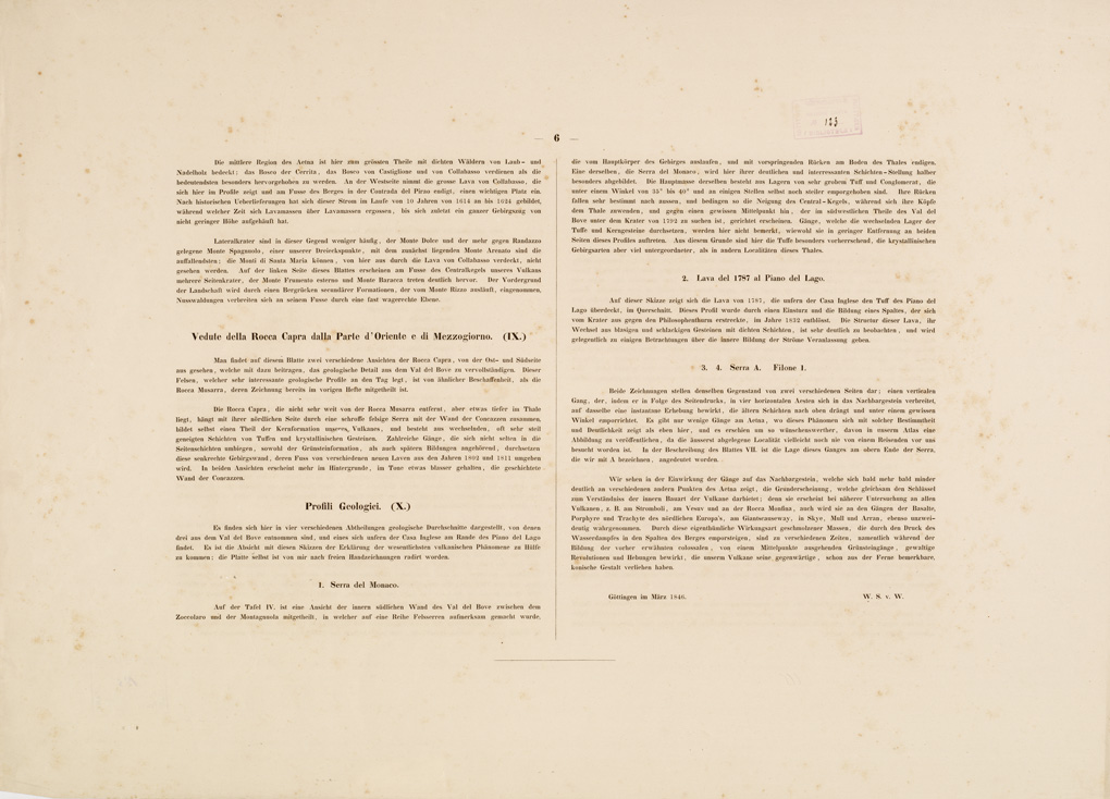 "I....PER IL BARONE SARTORIUS DI WALTERSHAUSEN COLL'ASSISTENZA DI SAV. CAVALLARI, C. F. PETERS E C. ROOS. ESEGUITA IN SICILIA DAL 1836 AL 1843. SAV. CAVALLARI SCUPLS. GOTTINGA 1844. CARATTERE DI G. SIEDENTOFF, FRANCOFORTE, S. M.. II....PER IL BARONE SARTORIUS DI WALTERSHAUSEN COLL'ASSISTENZA DI SAV. CAVALLARI, C. F. PETERS E C. ROOS ESEGUITA IN SICILIA DAL 1836 AL 1843. SAV. CAVALLARI E J. HEY SC. CARATTERE DI J. SIEDENTOFF. FRANCOFORTE S. M.. La carta si compone di 13 fogli tratti da incisione su rame, editi in Berlino da Simon Shropp dal 1844 al 1857. I titoli sono: I, Maletto II, Mojo III, Linguagrossa IV, Bronte V, Cratere VI, Giarre VII, Adernò VIII, Nicolosi IX, Aci-Reale X, Paternò XI, Catania XII, Aci Castello XIII, F. Simeto. Il foglio n. 12 contiene il titolo il foglio n. 13 della edizione geologica reca la leggenda dei colori adottati per la dimostrazione delle lave e dei terreni. Sono distinti: lave senza epoca, del Medio Evo, moderne, formazione centrale, basalto, crateri, tuffo vulcanico, jurassico, cretaceo inferiore, arenaria, conglomerati, terziario creta, terziario arene e ciottoli, gesso, alluvio. Il lavoro topografico è poggiato sui lavori trigonometrici condotti dall'A. e dal dott. Peters di Flensburg. La rete trigonometrica, derivata da una base misurata tra Portella e Gurna (Riposto) nel 1836 dal prof. Listing, venne estesa a coprire l'intero monte dell'Etna. Nel disegno topografico l'A. venne coadiuvato da C. Roos di Magonza e S. Cavallari di Palermo. Il disegno originale della carta venne eseguito in Sicilia alla scala di 1:30.000 in 100 fogli delle dimensioni ognuno di cm. 16x133 e fu ridotto quindi, per la pubblicazione, alla scala di 1:50.000. L'orografia vi è rappresentata con fine tratteggio. La carta si estende dalla foce del Simeto al cratere di Moyo (58.000 metri) e dal Capo di S. Andrea (Taormina) al Monte di Bolo (48.000 metri). Comprende quindi tutto il terreno lavico dell'Etna e le formazioni nettuniche viciniore. Alla carta sulla quale trovansi registrati tutti i materiali necessari per una completa conoscenza dell'Etna fino al 1842, va unito un testo in 21 fogli di grande formato che illustra le colate delle lave e ne fissa l'epoca contiene inoltre le coordinate dei punti trigonometrici determinati e 31 tavole incise su rame con vedute, profili e sezioni, queste ultime a colori."