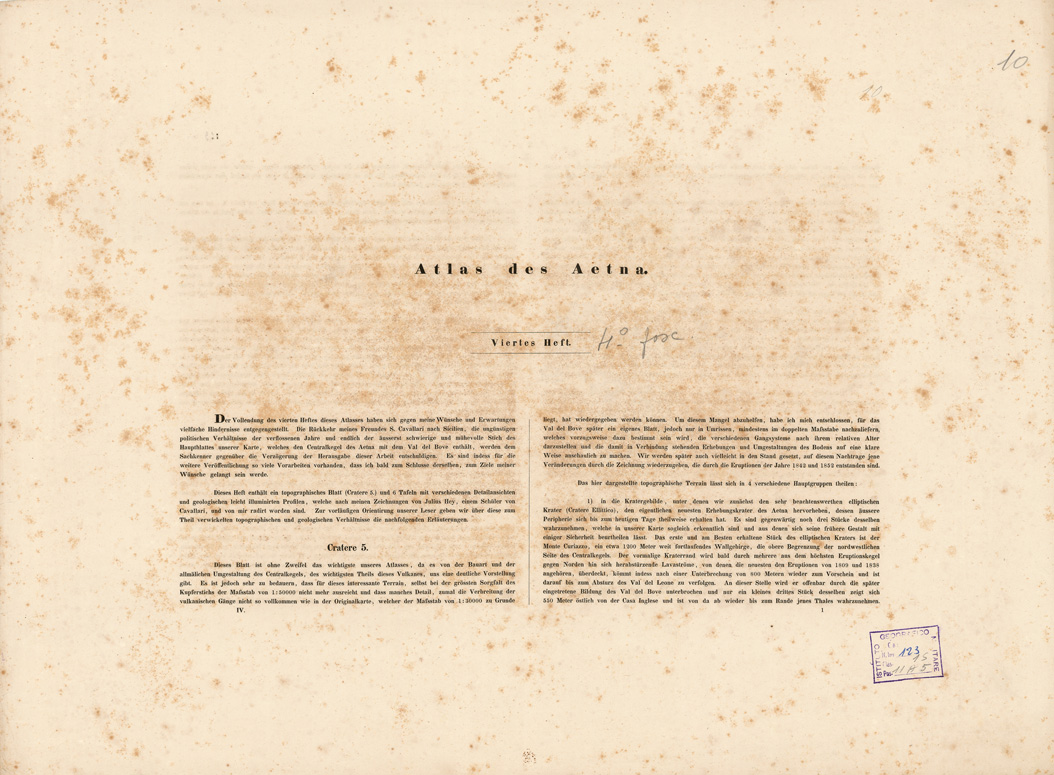 "I....PER IL BARONE SARTORIUS DI WALTERSHAUSEN COLL'ASSISTENZA DI SAV. CAVALLARI, C. F. PETERS E C. ROOS. ESEGUITA IN SICILIA DAL 1836 AL 1843. SAV. CAVALLARI SCUPLS. GOTTINGA 1844. CARATTERE DI G. SIEDENTOFF, FRANCOFORTE, S. M.. II....PER IL BARONE SARTORIUS DI WALTERSHAUSEN COLL'ASSISTENZA DI SAV. CAVALLARI, C. F. PETERS E C. ROOS ESEGUITA IN SICILIA DAL 1836 AL 1843. SAV. CAVALLARI E J. HEY SC. CARATTERE DI J. SIEDENTOFF. FRANCOFORTE S. M.. La carta si compone di 13 fogli tratti da incisione su rame, editi in Berlino da Simon Shropp dal 1844 al 1857. I titoli sono: I, Maletto II, Mojo III, Linguagrossa IV, Bronte V, Cratere VI, Giarre VII, Adernò VIII, Nicolosi IX, Aci-Reale X, Paternò XI, Catania XII, Aci Castello XIII, F. Simeto. Il foglio n. 12 contiene il titolo il foglio n. 13 della edizione geologica reca la leggenda dei colori adottati per la dimostrazione delle lave e dei terreni. Sono distinti: lave senza epoca, del Medio Evo, moderne, formazione centrale, basalto, crateri, tuffo vulcanico, jurassico, cretaceo inferiore, arenaria, conglomerati, terziario creta, terziario arene e ciottoli, gesso, alluvio. Il lavoro topografico è poggiato sui lavori trigonometrici condotti dall'A. e dal dott. Peters di Flensburg. La rete trigonometrica, derivata da una base misurata tra Portella e Gurna (Riposto) nel 1836 dal prof. Listing, venne estesa a coprire l'intero monte dell'Etna. Nel disegno topografico l'A. venne coadiuvato da C. Roos di Magonza e S. Cavallari di Palermo. Il disegno originale della carta venne eseguito in Sicilia alla scala di 1:30.000 in 100 fogli delle dimensioni ognuno di cm. 16x133 e fu ridotto quindi, per la pubblicazione, alla scala di 1:50.000. L'orografia vi è rappresentata con fine tratteggio. La carta si estende dalla foce del Simeto al cratere di Moyo (58.000 metri) e dal Capo di S. Andrea (Taormina) al Monte di Bolo (48.000 metri). Comprende quindi tutto il terreno lavico dell'Etna e le formazioni nettuniche viciniore. Alla carta sulla quale trovansi registrati tutti i materiali necessari per una completa conoscenza dell'Etna fino al 1842, va unito un testo in 21 fogli di grande formato che illustra le colate delle lave e ne fissa l'epoca contiene inoltre le coordinate dei punti trigonometrici determinati e 31 tavole incise su rame con vedute, profili e sezioni, queste ultime a colori."