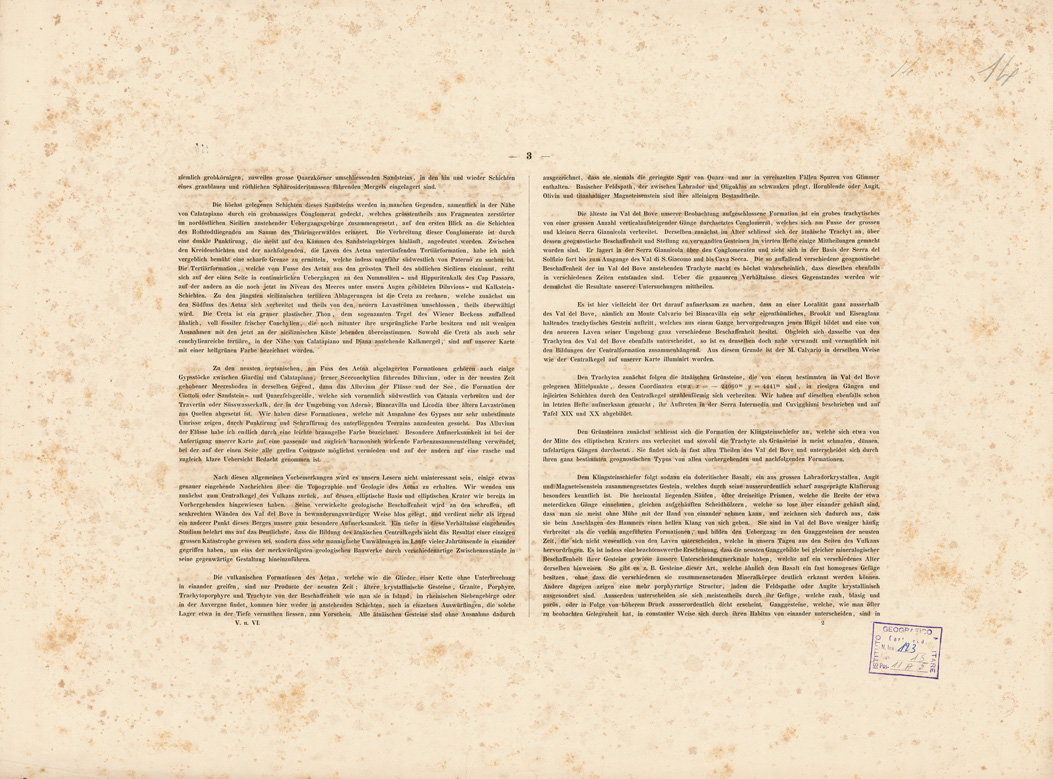 "I....PER IL BARONE SARTORIUS DI WALTERSHAUSEN COLL'ASSISTENZA DI SAV. CAVALLARI, C. F. PETERS E C. ROOS. ESEGUITA IN SICILIA DAL 1836 AL 1843. SAV. CAVALLARI SCUPLS. GOTTINGA 1844. CARATTERE DI G. SIEDENTOFF, FRANCOFORTE, S. M.. II....PER IL BARONE SARTORIUS DI WALTERSHAUSEN COLL'ASSISTENZA DI SAV. CAVALLARI, C. F. PETERS E C. ROOS ESEGUITA IN SICILIA DAL 1836 AL 1843. SAV. CAVALLARI E J. HEY SC. CARATTERE DI J. SIEDENTOFF. FRANCOFORTE S. M.. La carta si compone di 13 fogli tratti da incisione su rame, editi in Berlino da Simon Shropp dal 1844 al 1857. I titoli sono: I, Maletto II, Mojo III, Linguagrossa IV, Bronte V, Cratere VI, Giarre VII, Adernò VIII, Nicolosi IX, Aci-Reale X, Paternò XI, Catania XII, Aci Castello XIII, F. Simeto. Il foglio n. 12 contiene il titolo il foglio n. 13 della edizione geologica reca la leggenda dei colori adottati per la dimostrazione delle lave e dei terreni. Sono distinti: lave senza epoca, del Medio Evo, moderne, formazione centrale, basalto, crateri, tuffo vulcanico, jurassico, cretaceo inferiore, arenaria, conglomerati, terziario creta, terziario arene e ciottoli, gesso, alluvio. Il lavoro topografico è poggiato sui lavori trigonometrici condotti dall'A. e dal dott. Peters di Flensburg. La rete trigonometrica, derivata da una base misurata tra Portella e Gurna (Riposto) nel 1836 dal prof. Listing, venne estesa a coprire l'intero monte dell'Etna. Nel disegno topografico l'A. venne coadiuvato da C. Roos di Magonza e S. Cavallari di Palermo. Il disegno originale della carta venne eseguito in Sicilia alla scala di 1:30.000 in 100 fogli delle dimensioni ognuno di cm. 16x133 e fu ridotto quindi, per la pubblicazione, alla scala di 1:50.000. L'orografia vi è rappresentata con fine tratteggio. La carta si estende dalla foce del Simeto al cratere di Moyo (58.000 metri) e dal Capo di S. Andrea (Taormina) al Monte di Bolo (48.000 metri). Comprende quindi tutto il terreno lavico dell'Etna e le formazioni nettuniche viciniore. Alla carta sulla quale trovansi registrati tutti i materiali necessari per una completa conoscenza dell'Etna fino al 1842, va unito un testo in 21 fogli di grande formato che illustra le colate delle lave e ne fissa l'epoca contiene inoltre le coordinate dei punti trigonometrici determinati e 31 tavole incise su rame con vedute, profili e sezioni, queste ultime a colori."