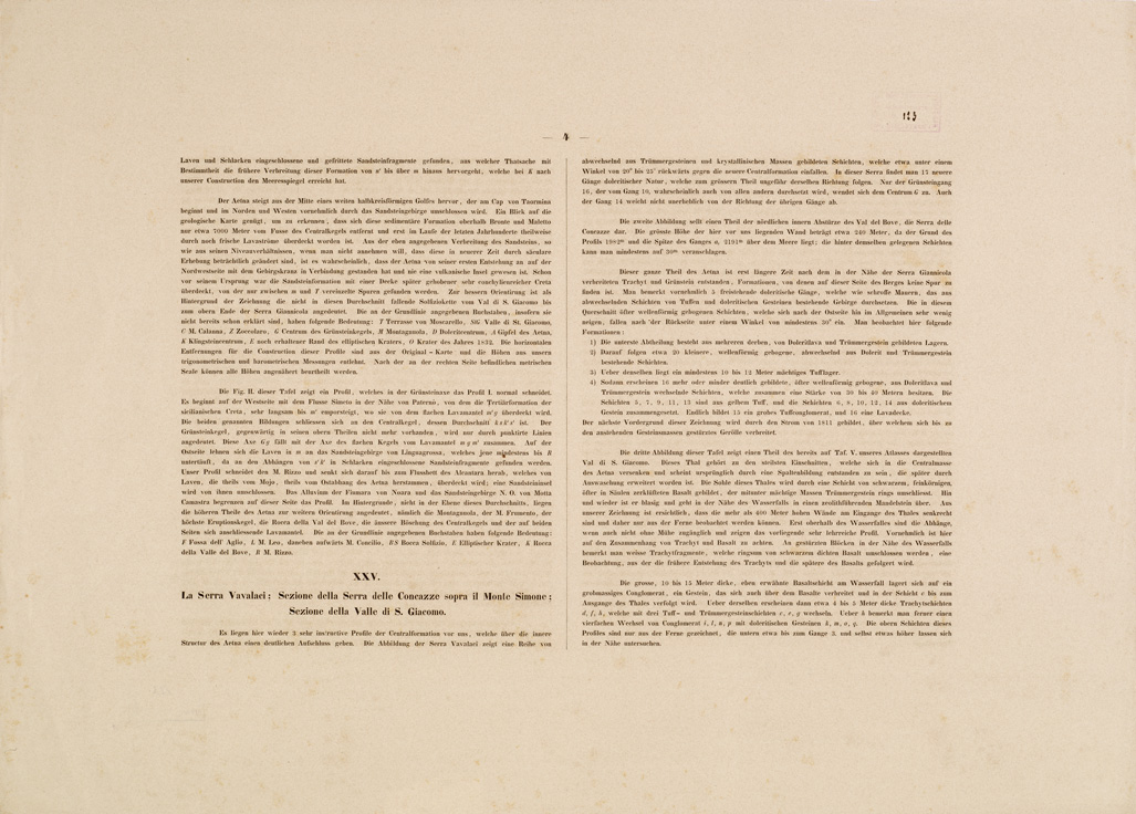 "I....PER IL BARONE SARTORIUS DI WALTERSHAUSEN COLL'ASSISTENZA DI SAV. CAVALLARI, C. F. PETERS E C. ROOS. ESEGUITA IN SICILIA DAL 1836 AL 1843. SAV. CAVALLARI SCUPLS. GOTTINGA 1844. CARATTERE DI G. SIEDENTOFF, FRANCOFORTE, S. M.. II....PER IL BARONE SARTORIUS DI WALTERSHAUSEN COLL'ASSISTENZA DI SAV. CAVALLARI, C. F. PETERS E C. ROOS ESEGUITA IN SICILIA DAL 1836 AL 1843. SAV. CAVALLARI E J. HEY SC. CARATTERE DI J. SIEDENTOFF. FRANCOFORTE S. M.. La carta si compone di 13 fogli tratti da incisione su rame, editi in Berlino da Simon Shropp dal 1844 al 1857. I titoli sono: I, Maletto II, Mojo III, Linguagrossa IV, Bronte V, Cratere VI, Giarre VII, Adernò VIII, Nicolosi IX, Aci-Reale X, Paternò XI, Catania XII, Aci Castello XIII, F. Simeto. Il foglio n. 12 contiene il titolo il foglio n. 13 della edizione geologica reca la leggenda dei colori adottati per la dimostrazione delle lave e dei terreni. Sono distinti: lave senza epoca, del Medio Evo, moderne, formazione centrale, basalto, crateri, tuffo vulcanico, jurassico, cretaceo inferiore, arenaria, conglomerati, terziario creta, terziario arene e ciottoli, gesso, alluvio. Il lavoro topografico è poggiato sui lavori trigonometrici condotti dall'A. e dal dott. Peters di Flensburg. La rete trigonometrica, derivata da una base misurata tra Portella e Gurna (Riposto) nel 1836 dal prof. Listing, venne estesa a coprire l'intero monte dell'Etna. Nel disegno topografico l'A. venne coadiuvato da C. Roos di Magonza e S. Cavallari di Palermo. Il disegno originale della carta venne eseguito in Sicilia alla scala di 1:30.000 in 100 fogli delle dimensioni ognuno di cm. 16x133 e fu ridotto quindi, per la pubblicazione, alla scala di 1:50.000. L'orografia vi è rappresentata con fine tratteggio. La carta si estende dalla foce del Simeto al cratere di Moyo (58.000 metri) e dal Capo di S. Andrea (Taormina) al Monte di Bolo (48.000 metri). Comprende quindi tutto il terreno lavico dell'Etna e le formazioni nettuniche viciniore. Alla carta sulla quale trovansi registrati tutti i materiali necessari per una completa conoscenza dell'Etna fino al 1842, va unito un testo in 21 fogli di grande formato che illustra le colate delle lave e ne fissa l'epoca contiene inoltre le coordinate dei punti trigonometrici determinati e 31 tavole incise su rame con vedute, profili e sezioni, queste ultime a colori."