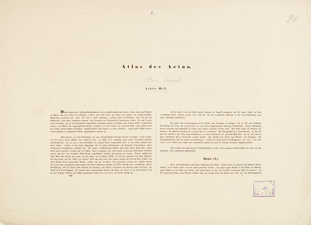 "I....PER IL BARONE SARTORIUS DI WALTERSHAUSEN COLL'ASSISTENZA DI SAV. CAVALLARI, C. F. PETERS E C. ROOS. ESEGUITA IN SICILIA DAL 1836 AL 1843. SAV. CAVALLARI SCUPLS. GOTTINGA 1844. CARATTERE DI G. SIEDENTOFF, FRANCOFORTE, S. M.. II....PER IL BARONE SARTORIUS DI WALTERSHAUSEN COLL'ASSISTENZA DI SAV. CAVALLARI, C. F. PETERS E C. ROOS ESEGUITA IN SICILIA DAL 1836 AL 1843. SAV. CAVALLARI E J. HEY SC. CARATTERE DI J. SIEDENTOFF. FRANCOFORTE S. M.. La carta si compone di 13 fogli tratti da incisione su rame, editi in Berlino da Simon Shropp dal 1844 al 1857. I titoli sono: I, Maletto II, Mojo III, Linguagrossa IV, Bronte V, Cratere VI, Giarre VII, Adernò VIII, Nicolosi IX, Aci-Reale X, Paternò XI, Catania XII, Aci Castello XIII, F. Simeto. Il foglio n. 12 contiene il titolo il foglio n. 13 della edizione geologica reca la leggenda dei colori adottati per la dimostrazione delle lave e dei terreni. Sono distinti: lave senza epoca, del Medio Evo, moderne, formazione centrale, basalto, crateri, tuffo vulcanico, jurassico, cretaceo inferiore, arenaria, conglomerati, terziario creta, terziario arene e ciottoli, gesso, alluvio. Il lavoro topografico è poggiato sui lavori trigonometrici condotti dall'A. e dal dott. Peters di Flensburg. La rete trigonometrica, derivata da una base misurata tra Portella e Gurna (Riposto) nel 1836 dal prof. Listing, venne estesa a coprire l'intero monte dell'Etna. Nel disegno topografico l'A. venne coadiuvato da C. Roos di Magonza e S. Cavallari di Palermo. Il disegno originale della carta venne eseguito in Sicilia alla scala di 1:30.000 in 100 fogli delle dimensioni ognuno di cm. 16x133 e fu ridotto quindi, per la pubblicazione, alla scala di 1:50.000. L'orografia vi è rappresentata con fine tratteggio. La carta si estende dalla foce del Simeto al cratere di Moyo (58.000 metri) e dal Capo di S. Andrea (Taormina) al Monte di Bolo (48.000 metri). Comprende quindi tutto il terreno lavico dell'Etna e le formazioni nettuniche viciniore. Alla carta sulla quale trovansi registrati tutti i materiali necessari per una completa conoscenza dell'Etna fino al 1842, va unito un testo in 21 fogli di grande formato che illustra le colate delle lave e ne fissa l'epoca contiene inoltre le coordinate dei punti trigonometrici determinati e 31 tavole incise su rame con vedute, profili e sezioni, queste ultime a colori."