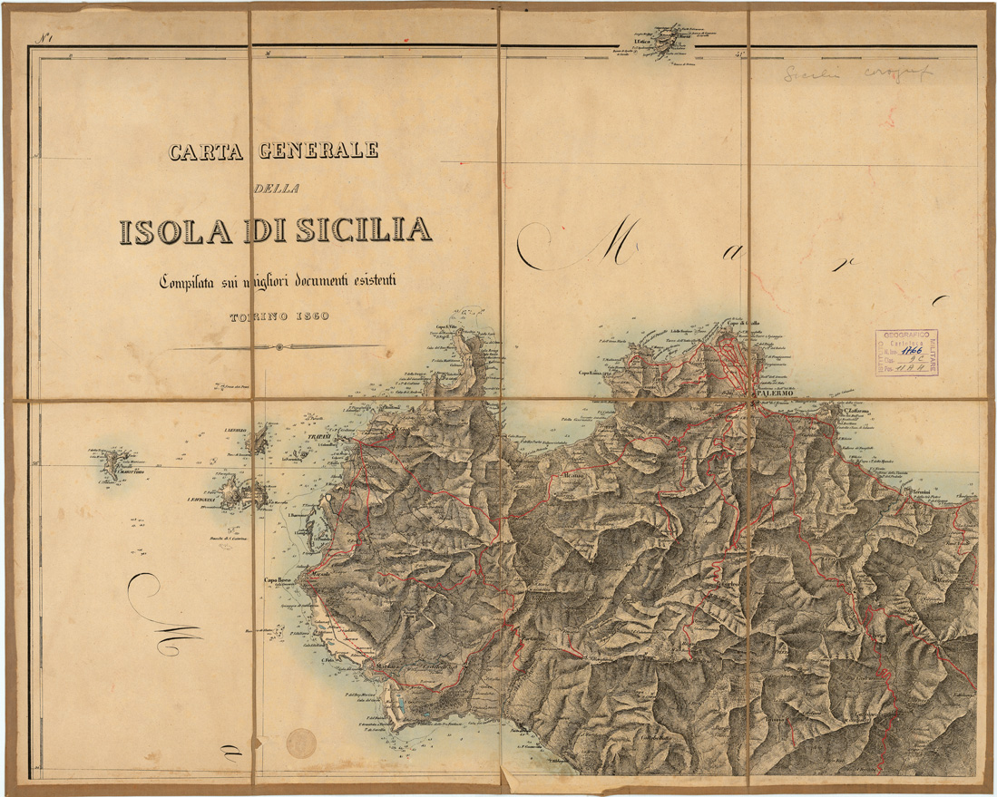 "La carta si compone di 4 fogli tratti da incisione su pietra, stampati a colori, montati su tela a stacchi. L'orografia è rappresentata col tratteggio a luce obliqua. Gli abitati sono distinti in base alla loro importanza amministrativa le strade sono classificate in rotabili, per cavalli, sentieri: sono distinte e tracciate in rosso le strade carrozzabili in esercizio e quelle in costruzione. La carta mostra inoltre arcivescovadi, vescovadi, castelli, molini, ecc., le linee del "telegrafo aereo" le regie caccie, i confini di valli, di distretto, di circondario. Scale grafiche in chilometri, miglia italiane, miglia di Sicilia. La carta è evidentemente derivata da quella al numero d'ordine 17 inventario 1735. L'esemplare posseduto manca del foglio sud-orientale. In appartenenza alla Biblioteca e all'Archivio sono una serie di carte sull'Isola di Sicilia pubblicate in anni diversi ma collegate fra loro. Questo il quadro riassuntivo di tali documenti: N° 7 d'ordine - Cart. d'Arch. 92 Docum. 1- anno 1809-10 N° 11 d'ordine - Inv. gen. 1735 bis - Files B0005160-63 - anno 1826 - copia su tela - Inv. gen. 1887 - Files B0005164-67 - anno 1826 - Inv. gen. 1887 ter - Files B0005172-75 - anno 1860 N° 17 d'ordine - Inv. gen. 1735 - anno 1826 - - Inv. gen. 1887 bis - Files B0005168-71 - anno 1860 N° 18 d'ordine - Inv. gen. 1766 - Files B0005335-38 - anno 1860"