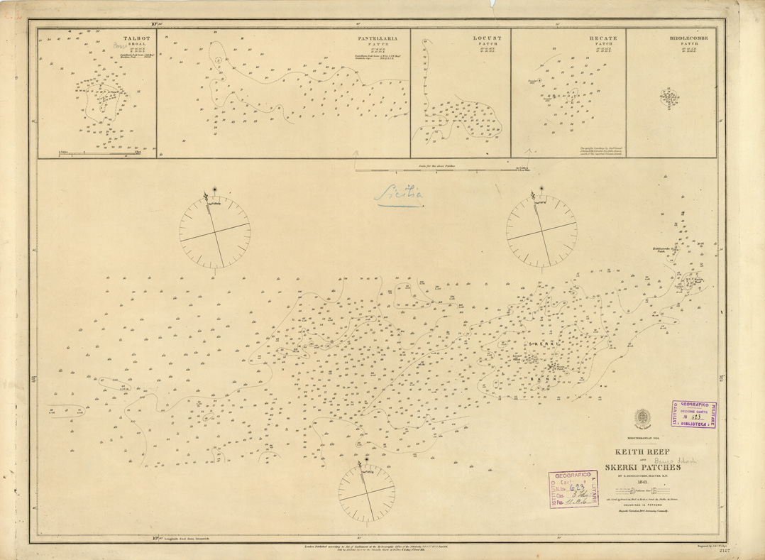 "Ammiragliato Britannico, Londra. In alto nei riquadri sono presenti rispettivamente: "Talbot shoal", "Pantellaria Patch", "Locust Patch", "Hecate Patch" e "Biddlecombe Patch"."