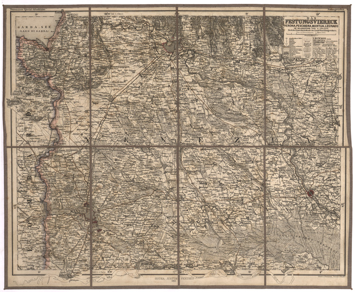 "...IM MAASSSTABE VON 1:150.000 NACH DER GENERALSTABSKARTE DES LOMB. VENET. KONIGREICH, ETC. VON A. PETERMANN, 1862. GOTHA, JUSTUS PERTHES. Un foglio del Petermann's Special-Atlasblatter con orografia a tratteggio in nero, strade principali e confini politici a colori. Il territorio rappresentato si estende da Pastrengo (nord) a Borgoforte (sud) e da Cavriana (ovest) a Cologna (est)."