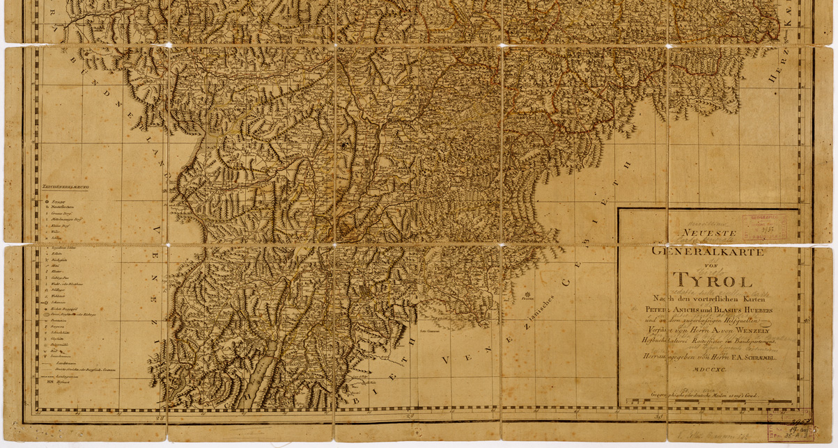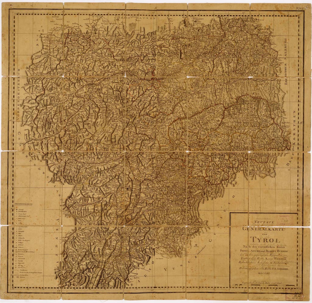 NEUESTE GENERALKARTE VON TYROL NACH DEN VORTRESLICHEN KARTEN PETERS ANTICHS UND BLASIUS HUEBERS UND ANDERN ZUVERLAESSIGEN HILFQUELLEN VERFAST VON HERRN A. VON WENZELY HOFBUCHHALTEREI RAITOFFIZIER IM BAUDEPARTEMENT.