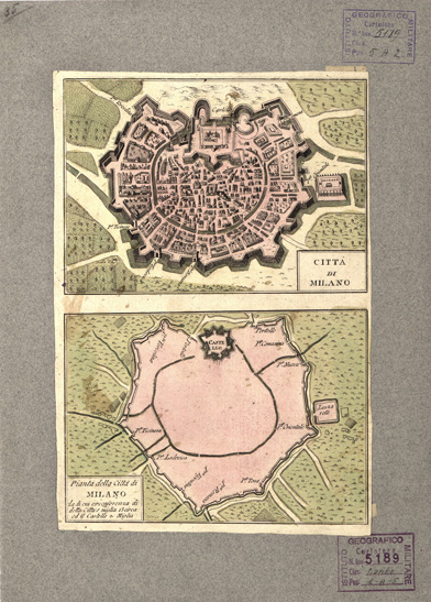 "Incisione su rame. Nello stesso foglio vi sono due piante di Milano. Dall'alto verso il basso hanno rispettivamente i titoli: "Città di Milano" e "Pianta della Città di Milano la di cui circonferenza di detta Città è miglia 13 circa ed il Castello 2 Miglia". Rappresentazione orografica prospettica e planimetrica."