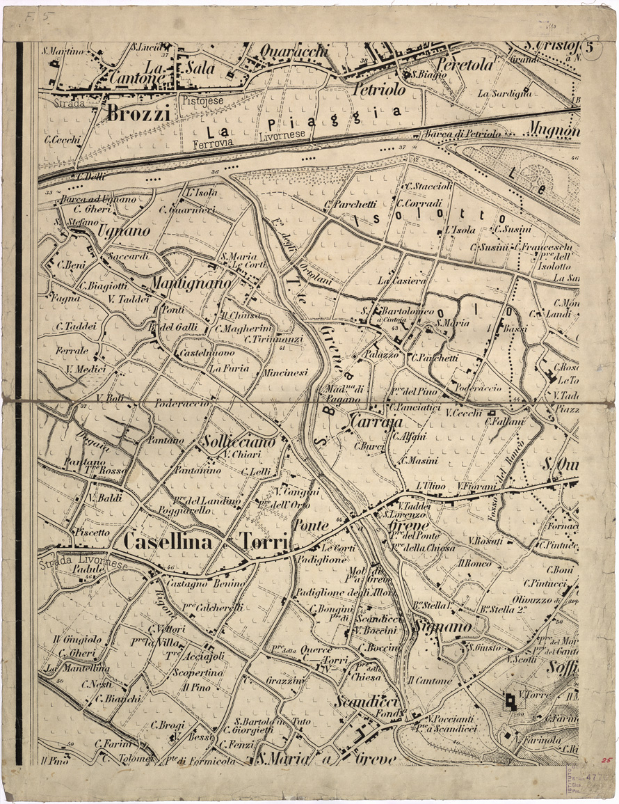 "...ALLA SCALA DI 1:7.500. 1876. Ingrandimento meccanico in 12 fogli montati su tela senza indicazione di autore. E' ritenuto però derivato dalla carta al 15.000 eseguita nel 1876 dagli Allievi dell' I.G.M. sotto la direzione del Sig. Moretti. Questa carta fu destinata a sostituire quella eseguita nel 1873 alla scala di 1:25.000 (vedi Catalogo Ragionato a pag. 333 Doc. N° 8765 e 8766, Cart. d' Arch. N° 66 e a pag. 334 Docum. 8768 Cart. d' Arch. N° 67). L' originale al 15.000 non è posseduto dall' Archivio dell' Istituto: se ne conserva bensì questo ingrandimento che documenta l' esattezza dei rilievi allora compiuti. L' orografia è rappresentata mediante tratteggio e curve di livello tracciate alla equidistanza di 10 metri. La carta mostra con ricchezza di dettagli, strade, abitati, costruzioni, corsi d' acqua, colture, ecc. Sono indicate le quote dei principali punti di elevazione."