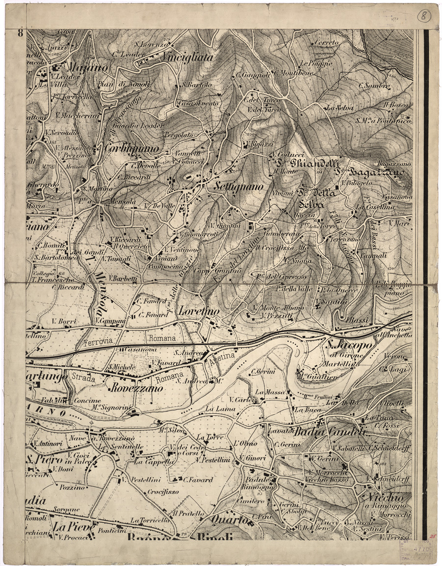 "...ALLA SCALA DI 1:7.500. 1876. Ingrandimento meccanico in 12 fogli montati su tela senza indicazione di autore. E' ritenuto però derivato dalla carta al 15.000 eseguita nel 1876 dagli Allievi dell' I.G.M. sotto la direzione del Sig. Moretti. Questa carta fu destinata a sostituire quella eseguita nel 1873 alla scala di 1:25.000 (vedi Catalogo Ragionato a pag. 333 Doc. N° 8765 e 8766, Cart. d' Arch. N° 66 e a pag. 334 Docum. 8768 Cart. d' Arch. N° 67). L' originale al 15.000 non è posseduto dall' Archivio dell' Istituto: se ne conserva bensì questo ingrandimento che documenta l' esattezza dei rilievi allora compiuti. L' orografia è rappresentata mediante tratteggio e curve di livello tracciate alla equidistanza di 10 metri. La carta mostra con ricchezza di dettagli, strade, abitati, costruzioni, corsi d' acqua, colture, ecc. Sono indicate le quote dei principali punti di elevazione."