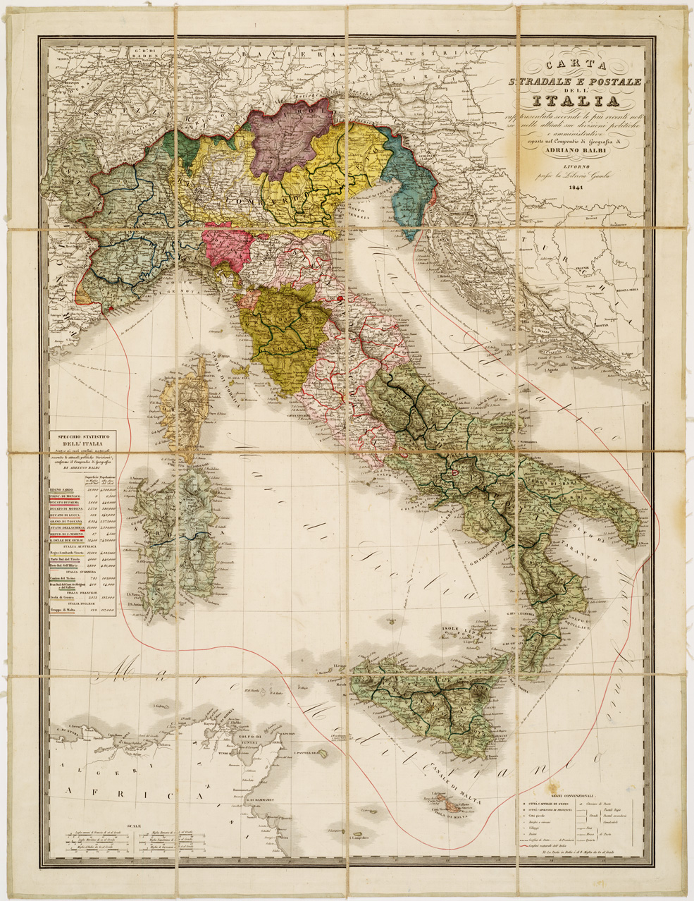 CARTA STRADALE E POSTALE DELL'ITALIA RAPPRESENTATA SECONDO LE PIU' RECENTI NOTIZIE NELLE ATTUALI SUE DIVISIONI POLITICHE E AMMINISTRATIVE ESPOSTE NEL COMPENDIO DI GEOGRAFIA DI ADRIANO BALBI. LIVORNO, PRESSO LA LIBRERIA GAMBO.