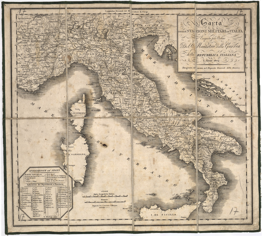 CARTA DELLE STAZIONI MILITARI IN ITALIA ESEGUITA PER ORDINE DEL MINISTERO DELLA GUERRA DELLA REPUBBLICA ITALIANA. DISEGNATA ED INCISA NEL DEPOSITO GENERALE DELLA GUERRA.