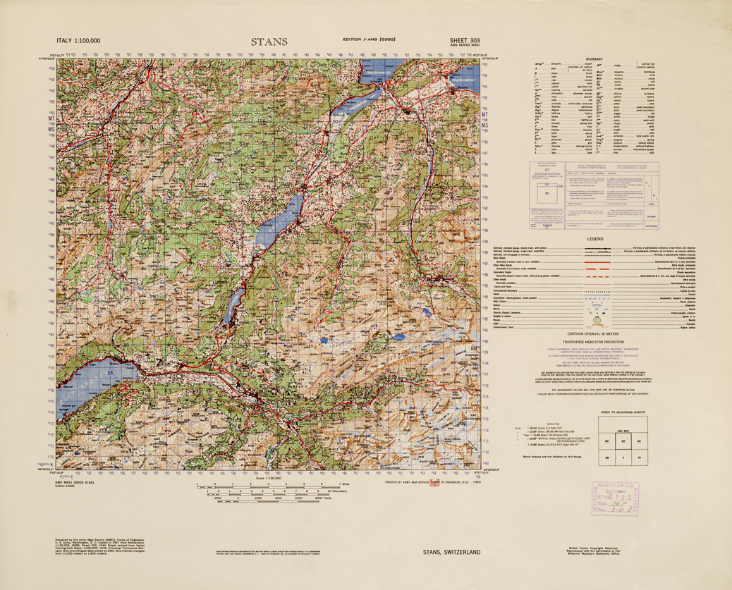 "Autore Army Map. Servige Corp of Engineers. Rappresentazione orografica a curve di livello."