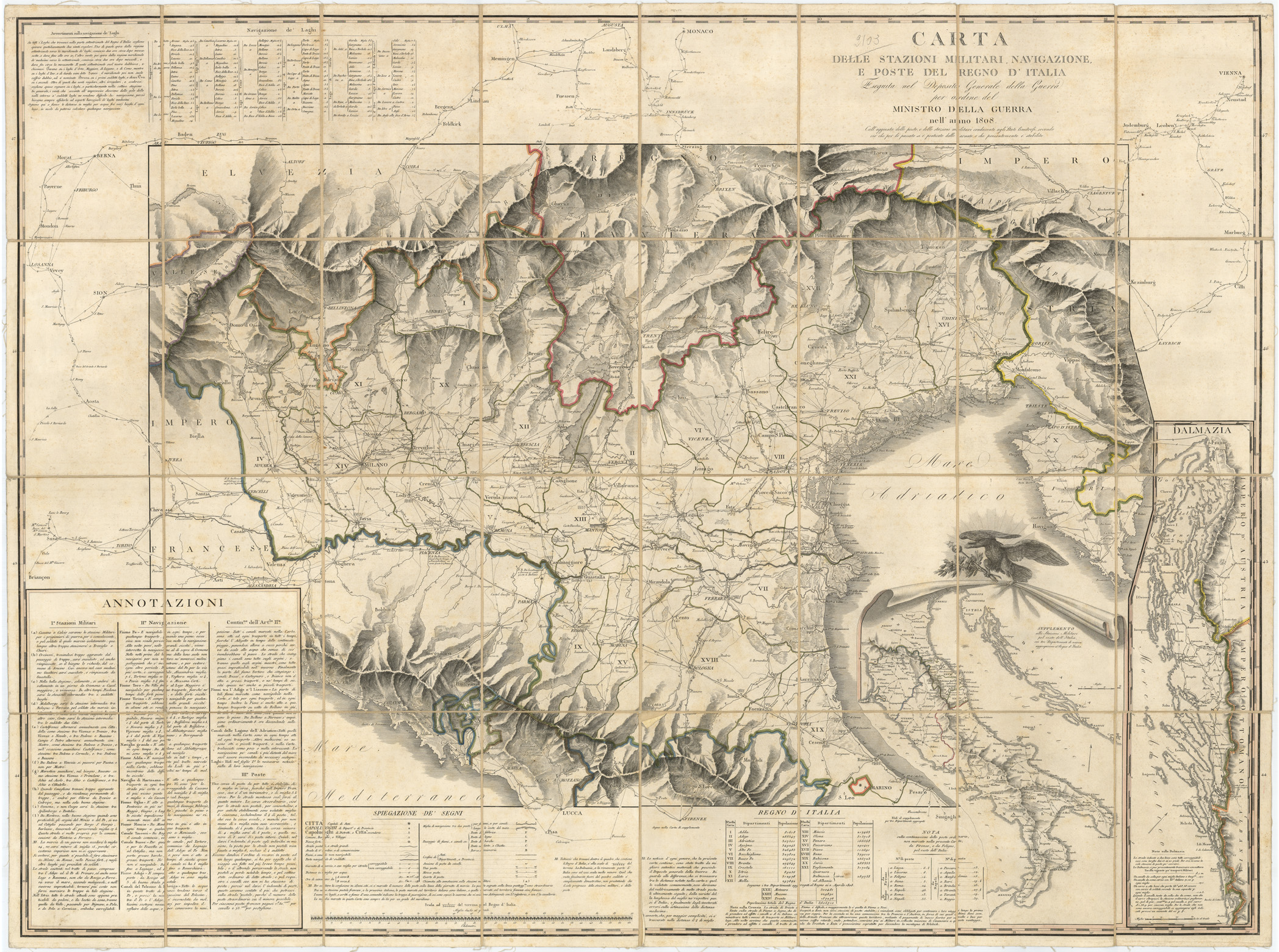 CARTA DELLE STAZIONI MILITARI, NAVIGAZIONE E POSTE DEL REGNO D'ITALIA ESEGUITA NEL DEPOSITO GENERALE DELLA GUERRA PER ORDINE DEL MINISTERO DELLA GUERRA NELL'ANNO 1808.