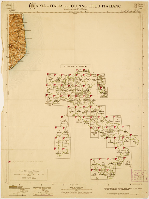 "Rappresentazione orografica a tratteggio. In basso è presente l'elenco delle strade, le distanze chilometriche sono indicate dalle cifre in rosso. Le pendenze in percentuale sono indicate sulle strade di grande comunicazione. Per l'elenco completo dei segni convenzionali e delle abbreviazioni si rimanda al foglio n. 26. La scala del quadro d'unione è di 1:4.000.000. Touring Club Italiano, Milano. Proprietà artistico-letteraria stampa A. Vallardi, Milano. Le copie sono le stesse dell'altro quadro d'unione."