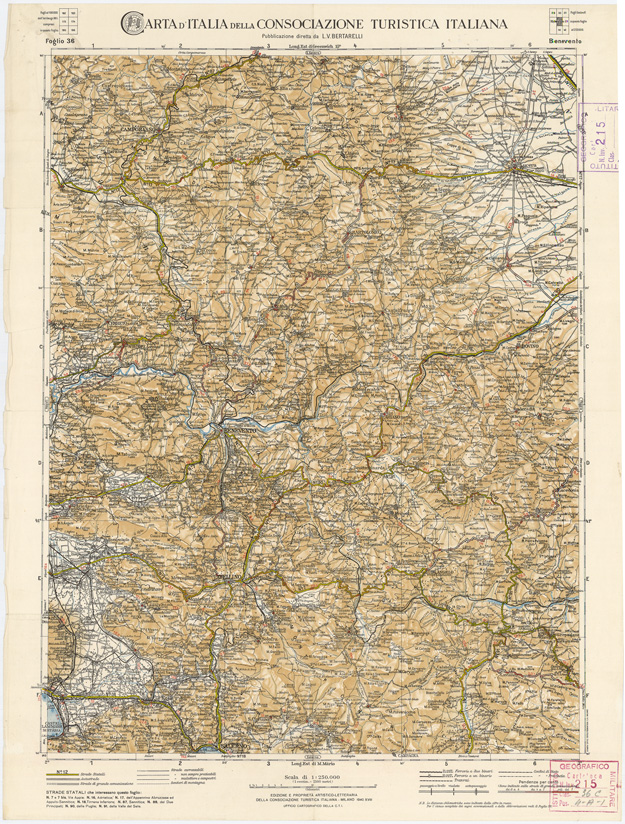 "Rappresentazione orografica a tratteggio. In basso è presente l'elenco delle strade, le distanze chilometriche sono indicate dalle cifre in rosso. Le pendenze in percentuale sono indicate sulle strade di grande comunicazione. Per l'elenco completo dei segni convenzionali e delle abbreviazioni si rimanda al foglio n. 26. Touring Club Italiano, Milano. Edizione e proprietà artistico-letteraria della Consociazione Turistica Italiana, Milano stampa Officine Fotolitografiche S. A., Milano."