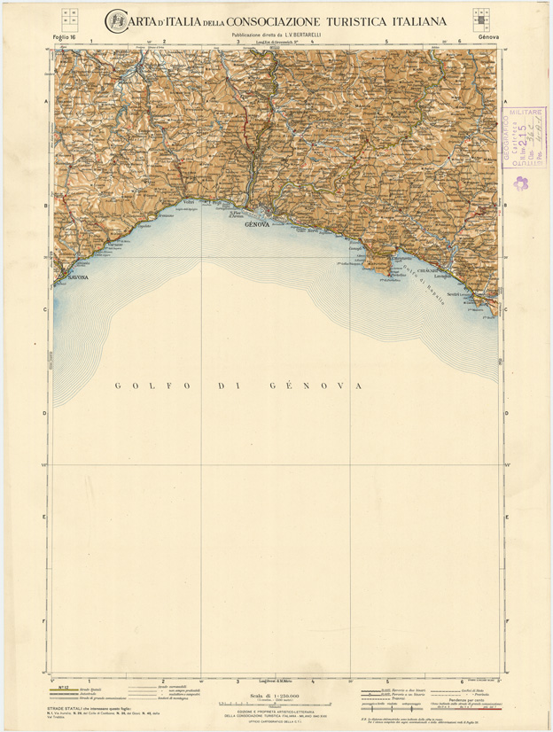 CARTA D'ITALIA DEL TOURING CLUB ITALIANO PUBBLICAZIONE DIRETTA DA L.V. BERTARELLI - Foglio 16 - Genova.
