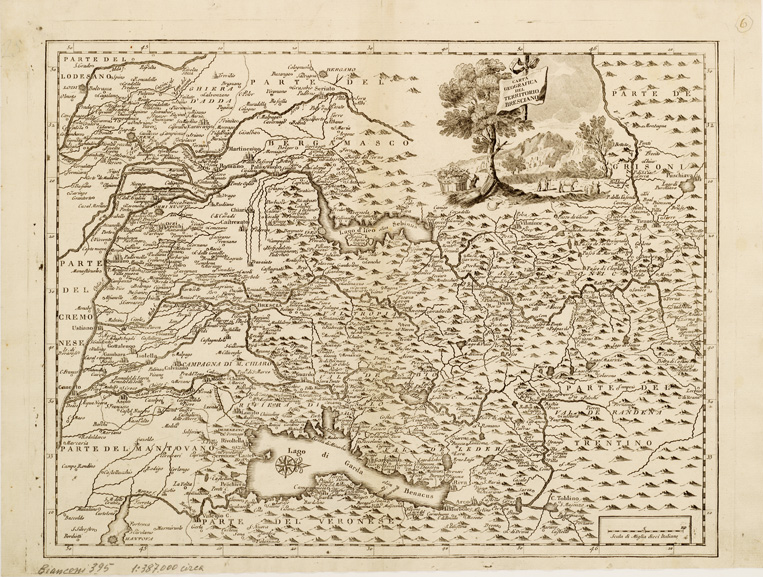 "Gruppo di tredici carte, sette delle quali relative alla regione Lombardo-Veneta. Sono le stesse carte di cui al n. 393 Collez. Bianconi, n. 18 d'ordine. Incisione su rame. Rappresentazione orografica prospettica. Scala grafica di miglia dieci italiane. La scala è scritta a matita sulla carta. Grafia in lingua italiana e latina."