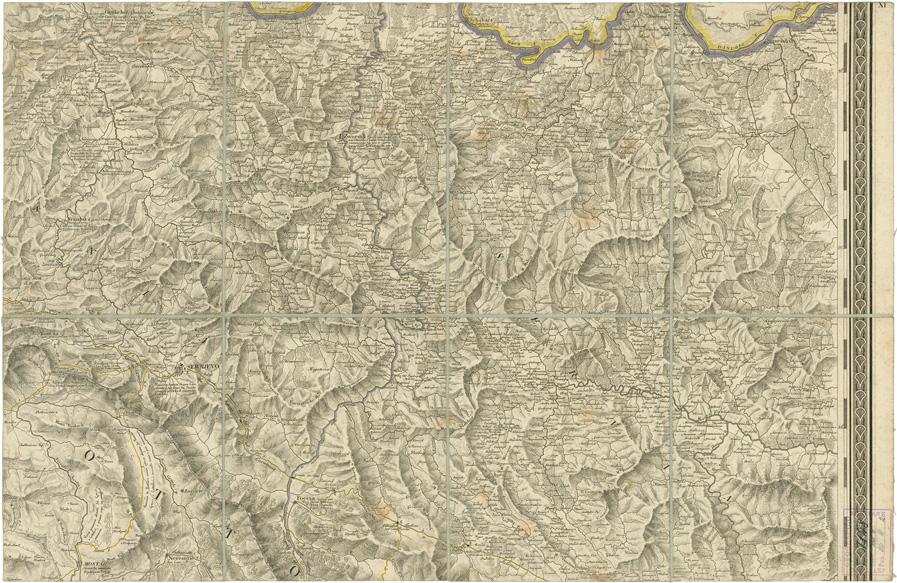 "...CO LORO DIVERSI STABILIMENTI E CON UNA PARTE DEGLI STATI LIMITROFI. Carta compilata per ordine Superiore nel deposito della guerra del Regno d'Italia nell'anno MDCCCXIII. Rappresentazione orografica a tratteggio a luce obliqua. Carta incisa sotto la vigilanza di G. Bordiga Capo Incisore B. Bordiga incise le montagne. Accanto al titolo vi sono i segni convenzionali, sotto le annotazioni sulla costruzione di questa carta. Nel foglio XII ci sono le scale del terreno in miglia 30 italiane di 60 al grado, in leghe di Francia di 25 al grado e in chilometri."