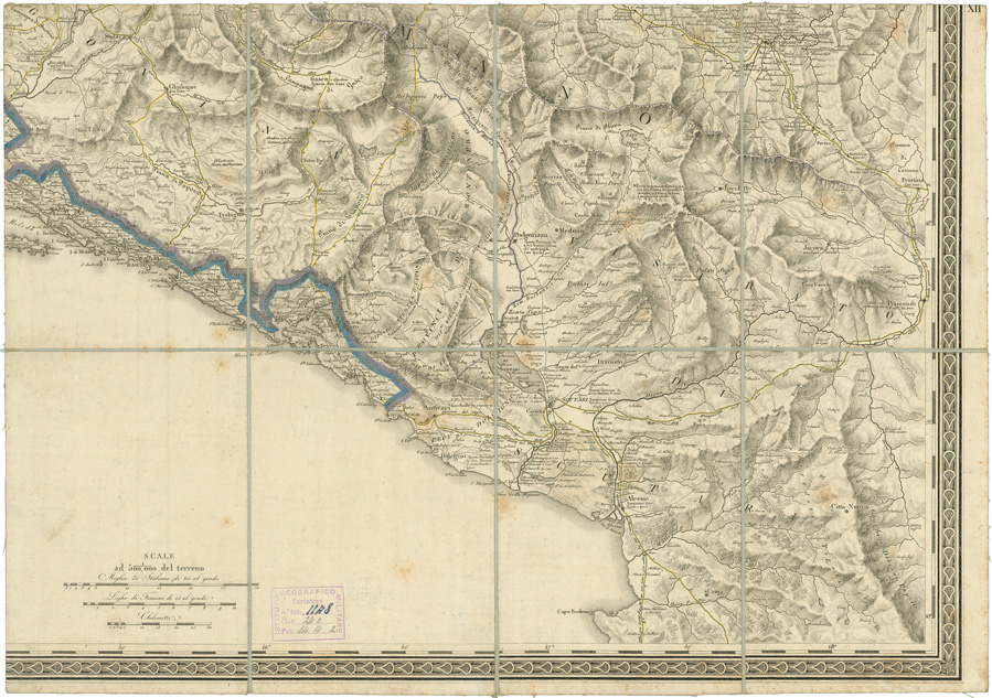 "...CO LORO DIVERSI STABILIMENTI E CON UNA PARTE DEGLI STATI LIMITROFI. Carta compilata per ordine Superiore nel deposito della guerra del Regno d'Italia nell'anno MDCCCXIII. Rappresentazione orografica a tratteggio a luce obliqua. Carta incisa sotto la vigilanza di G. Bordiga Capo Incisore B. Bordiga incise le montagne. Accanto al titolo vi sono i segni convenzionali, sotto le annotazioni sulla costruzione di questa carta. Nel foglio XII ci sono le scale del terreno in miglia 30 italiane di 60 al grado, in leghe di Francia di 25 al grado e in chilometri."