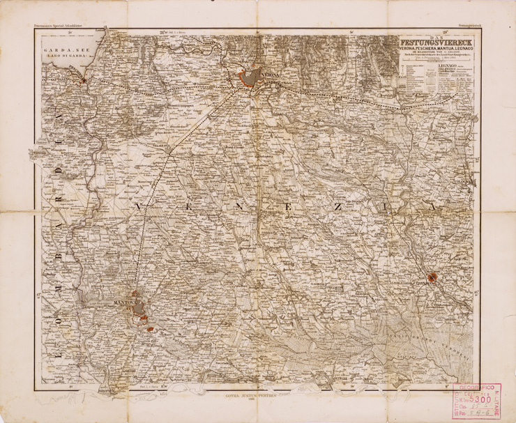 "...NACH DER GENERALSTABSKARTE DES LOMB. VENET. KONIGREICHS & C. VON A. PETERMANN. Rappresentazione orografica a tratteggio. Sotto al titolo sono presenti i segni convenzionali. Grafia in lingua italiana e tedesca. Justus Perthes, Gotha."