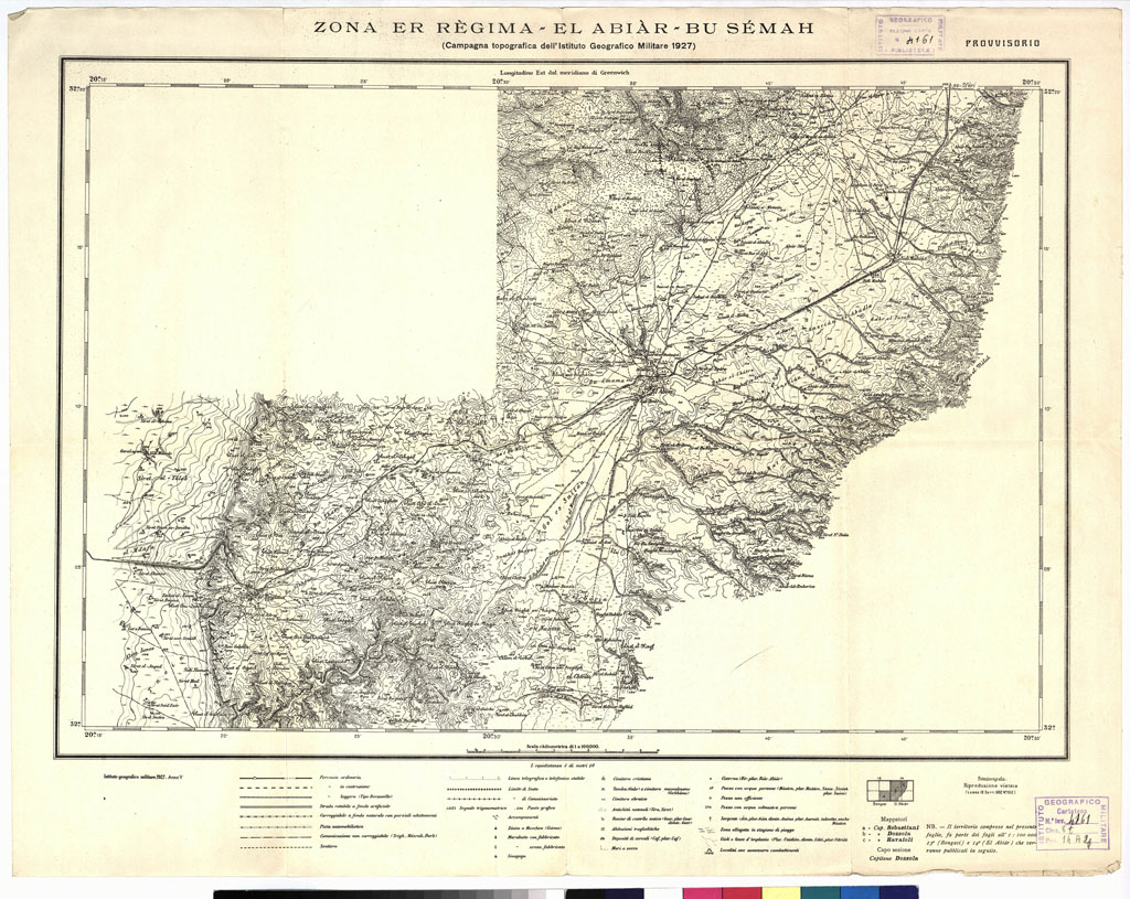 "Fogli N°: 6, 12, 13, 20, 21, 24, 25 (DRIANA, BOMBA, BENGASI, TÒBRUCK, UEL-HATIAN, BARDIA, AMSÉAT). Governo della Cirenaica. Ufficio Studi. Questa carta è fondata sulle campagne annuali di operatori concessi dall'I.G.M. al Governo della Cirenaica (Ufficio Studi) che procede al rilevamento del territorio stesso. Per la compilazione si sono incorporati anche i rilievi eseguiti dal 1919 in poi dall'I.G.M. (pubblicati alla scala di 1:50.000, ved. N° 16 d'ordine, N. 2454 d'inventario) per la fascia costiera da Bengasi a oltre Derna e nell'interno per una quarantina di km. Tali rilievi sono gradualmente ridotti e inquadrati nei fogli al 1:100.000 comprendenti 30' di longitudine per 20' di latitudine: il lavoro di ridisegno selezione e aggiornamento è fatto presso 1'Ufficio Studi la riduzione è fatta presso l'I.G.M. con sistema fotomeccanico. Le direttive per i rilievi sono date volta volta dall'Ufficio Studi del Governo che stabilisce la forma definitiva della toponomastica italiana e araba in base alle Norme emanate dal Ministero delle Colonie con Decreto I febbraio 1915. Ogni foglio è accompagnato dall'indice bilingue dei nomi contenuti. La carta viene stampata in nero. Le forme del rilievo sono rappresentate con curve di livello tracciate all'equidistanza di 10 metri. Le curve batometriche sono dedotte dagli scandagli della R. Marina. La carta mostra le ferrovie (ferrovia ordinaria, in costruzione, decauville), le strade (rotabile a fondo artificiale, carreggiabile a fondo naturale con parziali adattamenti, piste automobilistiche, comunicazioni non carreggiabili, sentiero) linee telegrafiche, limiti di stato e di commissariato, campi d'aviazione, zauie e moschee, marabutti (con fabbricato e senza), sinagoghe, cimiteri (cristiani, mussulmani ed ebraici), antichità, rovine, abitazioni trogloditiche, cisterne, pozzi e sorgenti, le zone allagate in periodo di piogge, gli uàdi, le località ove avvennero combattimenti, ecc. Campagna topografica dell' I.G.M. Foglio provvisorio"