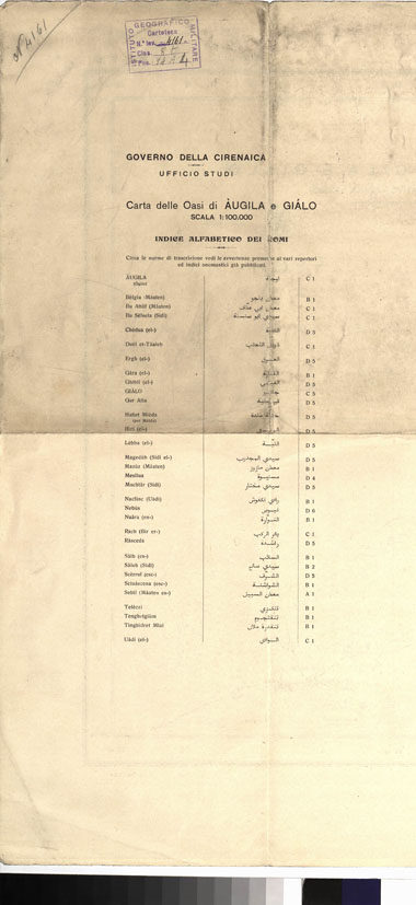 "Fogli N°: 6, 12, 13, 20, 21, 24, 25 (DRIANA, BOMBA, BENGASI, TÒBRUCK, UEL-HATIAN, BARDIA, AMSÉAT). Governo della Cirenaica. Ufficio Studi. Questa carta è fondata sulle campagne annuali di operatori concessi dall'I.G.M. al Governo della Cirenaica (Ufficio Studi) che procede al rilevamento del territorio stesso. Per la compilazione si sono incorporati anche i rilievi eseguiti dal 1919 in poi dall'I.G.M. (pubblicati alla scala di 1:50.000, ved. N° 16 d'ordine, N. 2454 d'inventario) per la fascia costiera da Bengasi a oltre Derna e nell'interno per una quarantina di km. Tali rilievi sono gradualmente ridotti e inquadrati nei fogli al 1:100.000 comprendenti 30' di longitudine per 20' di latitudine: il lavoro di ridisegno selezione e aggiornamento è fatto presso 1'Ufficio Studi la riduzione è fatta presso l'I.G.M. con sistema fotomeccanico. Le direttive per i rilievi sono date volta volta dall'Ufficio Studi del Governo che stabilisce la forma definitiva della toponomastica italiana e araba in base alle Norme emanate dal Ministero delle Colonie con Decreto I febbraio 1915. Ogni foglio è accompagnato dall'indice bilingue dei nomi contenuti. La carta viene stampata in nero. Le forme del rilievo sono rappresentate con curve di livello tracciate all'equidistanza di 10 metri. Le curve batometriche sono dedotte dagli scandagli della R. Marina. La carta mostra le ferrovie (ferrovia ordinaria, in costruzione, decauville), le strade (rotabile a fondo artificiale, carreggiabile a fondo naturale con parziali adattamenti, piste automobilistiche, comunicazioni non carreggiabili, sentiero) linee telegrafiche, limiti di stato e di commissariato, campi d'aviazione, zauie e moschee, marabutti (con fabbricato e senza), sinagoghe, cimiteri (cristiani, mussulmani ed ebraici), antichità, rovine, abitazioni trogloditiche, cisterne, pozzi e sorgenti, le zone allagate in periodo di piogge, gli uàdi, le località ove avvennero combattimenti, ecc."