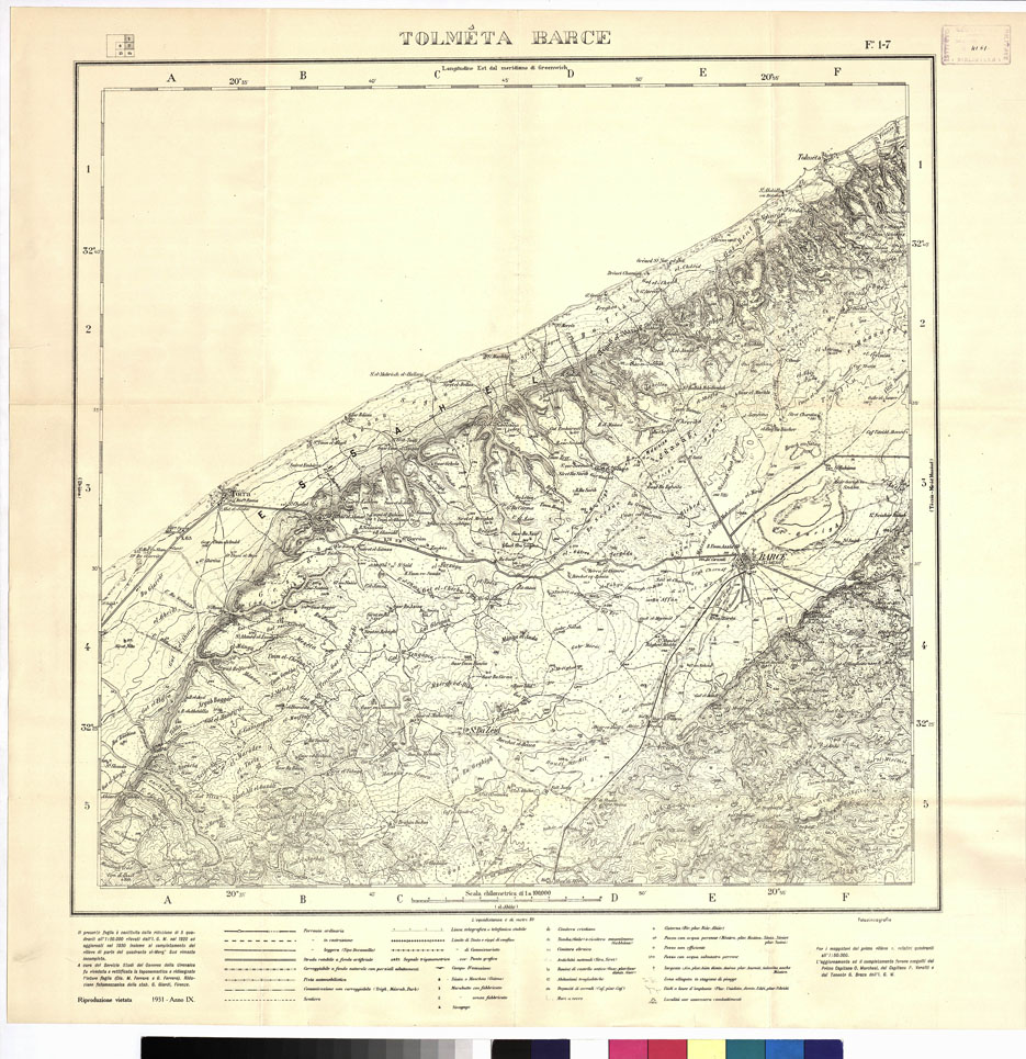 "Fogli N°: 6, 12, 13, 20, 21, 24, 25 (DRIANA, BOMBA, BENGASI, TÒBRUCK, UEL-HATIAN, BARDIA, AMSÉAT). Governo della Cirenaica. Ufficio Studi. Questa carta è fondata sulle campagne annuali di operatori concessi dall'I.G.M. al Governo della Cirenaica (Ufficio Studi) che procede al rilevamento del territorio stesso. Per la compilazione si sono incorporati anche i rilievi eseguiti dal 1919 in poi dall'I.G.M. (pubblicati alla scala di 1:50.000, ved. N° 16 d'ordine, N. 2454 d'inventario) per la fascia costiera da Bengasi a oltre Derna e nell'interno per una quarantina di km. Tali rilievi sono gradualmente ridotti e inquadrati nei fogli al 1:100.000 comprendenti 30' di longitudine per 20' di latitudine: il lavoro di ridisegno selezione e aggiornamento è fatto presso 1'Ufficio Studi la riduzione è fatta presso l'I.G.M. con sistema fotomeccanico. Le direttive per i rilievi sono date volta volta dall'Ufficio Studi del Governo che stabilisce la forma definitiva della toponomastica italiana e araba in base alle Norme emanate dal Ministero delle Colonie con Decreto I febbraio 1915. Ogni foglio è accompagnato dall'indice bilingue dei nomi contenuti. La carta viene stampata in nero. Le forme del rilievo sono rappresentate con curve di livello tracciate all'equidistanza di 10 metri. Le curve batometriche sono dedotte dagli scandagli della R. Marina. La carta mostra le ferrovie (ferrovia ordinaria, in costruzione, decauville), le strade (rotabile a fondo artificiale, carreggiabile a fondo naturale con parziali adattamenti, piste automobilistiche, comunicazioni non carreggiabili, sentiero) linee telegrafiche, limiti di stato e di commissariato, campi d'aviazione, zauie e moschee, marabutti (con fabbricato e senza), sinagoghe, cimiteri (cristiani, mussulmani ed ebraici), antichità, rovine, abitazioni trogloditiche, cisterne, pozzi e sorgenti, le zone allagate in periodo di piogge, gli uàdi, le località ove avvennero combattimenti, ecc."
