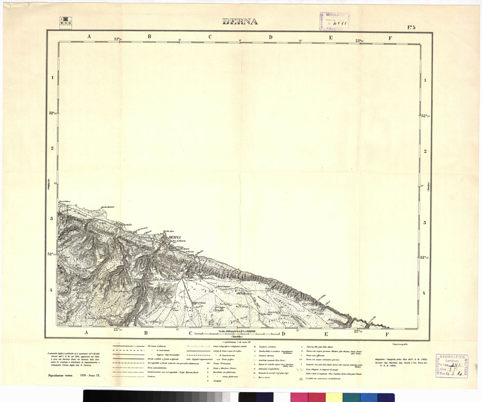 "Fogli N°: 6, 12, 13, 20, 21, 24, 25 (DRIANA, BOMBA, BENGASI, TÒBRUCK, UEL-HATIAN, BARDIA, AMSÉAT). Governo della Cirenaica. Ufficio Studi. Questa carta è fondata sulle campagne annuali di operatori concessi dall'I.G.M. al Governo della Cirenaica (Ufficio Studi) che procede al rilevamento del territorio stesso. Per la compilazione si sono incorporati anche i rilievi eseguiti dal 1919 in poi dall'I.G.M. (pubblicati alla scala di 1:50.000, ved. N° 16 d'ordine, N. 2454 d'inventario) per la fascia costiera da Bengasi a oltre Derna e nell'interno per una quarantina di km. Tali rilievi sono gradualmente ridotti e inquadrati nei fogli al 1:100.000 comprendenti 30' di longitudine per 20' di latitudine: il lavoro di ridisegno selezione e aggiornamento è fatto presso 1'Ufficio Studi la riduzione è fatta presso l'I.G.M. con sistema fotomeccanico. Le direttive per i rilievi sono date volta volta dall'Ufficio Studi del Governo che stabilisce la forma definitiva della toponomastica italiana e araba in base alle Norme emanate dal Ministero delle Colonie con Decreto I febbraio 1915. Ogni foglio è accompagnato dall'indice bilingue dei nomi contenuti. La carta viene stampata in nero. Le forme del rilievo sono rappresentate con curve di livello tracciate all'equidistanza di 10 metri. Le curve batometriche sono dedotte dagli scandagli della R. Marina. La carta mostra le ferrovie (ferrovia ordinaria, in costruzione, decauville), le strade (rotabile a fondo artificiale, carreggiabile a fondo naturale con parziali adattamenti, piste automobilistiche, comunicazioni non carreggiabili, sentiero) linee telegrafiche, limiti di stato e di commissariato, campi d'aviazione, zauie e moschee, marabutti (con fabbricato e senza), sinagoghe, cimiteri (cristiani, mussulmani ed ebraici), antichità, rovine, abitazioni trogloditiche, cisterne, pozzi e sorgenti, le zone allagate in periodo di piogge, gli uàdi, le località ove avvennero combattimenti, ecc."
