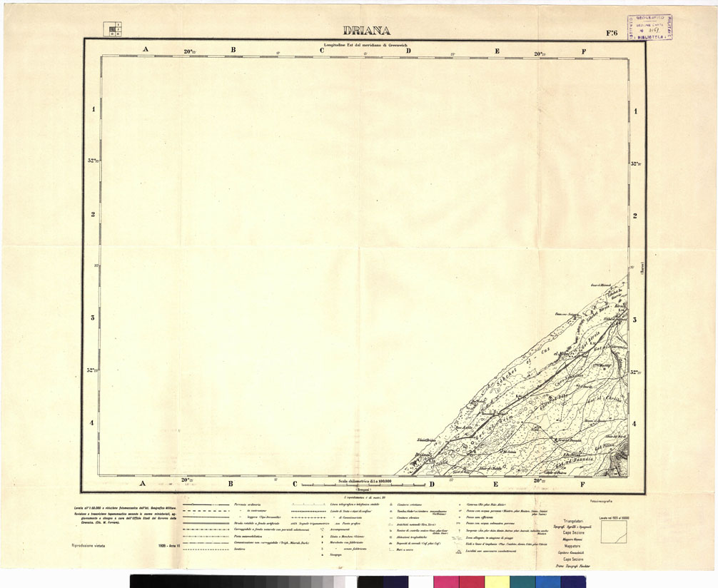 "Fogli N°: 6, 12, 13, 20, 21, 24, 25 (DRIANA, BOMBA, BENGASI, TÒBRUCK, UEL-HATIAN, BARDIA, AMSÉAT). Governo della Cirenaica. Ufficio Studi. Questa carta è fondata sulle campagne annuali di operatori concessi dall'I.G.M. al Governo della Cirenaica (Ufficio Studi) che procede al rilevamento del territorio stesso. Per la compilazione si sono incorporati anche i rilievi eseguiti dal 1919 in poi dall'I.G.M. (pubblicati alla scala di 1:50.000, ved. N° 16 d'ordine, N. 2454 d'inventario) per la fascia costiera da Bengasi a oltre Derna e nell'interno per una quarantina di km. Tali rilievi sono gradualmente ridotti e inquadrati nei fogli al 1:100.000 comprendenti 30' di longitudine per 20' di latitudine: il lavoro di ridisegno selezione e aggiornamento è fatto presso 1'Ufficio Studi la riduzione è fatta presso l'I.G.M. con sistema fotomeccanico. Le direttive per i rilievi sono date volta volta dall'Ufficio Studi del Governo che stabilisce la forma definitiva della toponomastica italiana e araba in base alle Norme emanate dal Ministero delle Colonie con Decreto I febbraio 1915. Ogni foglio è accompagnato dall'indice bilingue dei nomi contenuti. La carta viene stampata in nero. Le forme del rilievo sono rappresentate con curve di livello tracciate all'equidistanza di 10 metri. Le curve batometriche sono dedotte dagli scandagli della R. Marina. La carta mostra le ferrovie (ferrovia ordinaria, in costruzione, decauville), le strade (rotabile a fondo artificiale, carreggiabile a fondo naturale con parziali adattamenti, piste automobilistiche, comunicazioni non carreggiabili, sentiero) linee telegrafiche, limiti di stato e di commissariato, campi d'aviazione, zauie e moschee, marabutti (con fabbricato e senza), sinagoghe, cimiteri (cristiani, mussulmani ed ebraici), antichità, rovine, abitazioni trogloditiche, cisterne, pozzi e sorgenti, le zone allagate in periodo di piogge, gli uàdi, le località ove avvennero combattimenti, ecc."