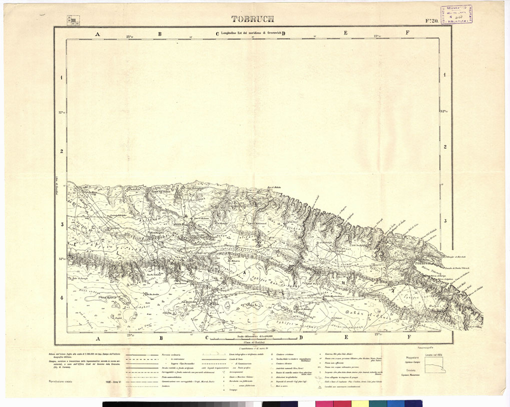 "Fogli N°: 6, 12, 13, 20, 21, 24, 25 (DRIANA, BOMBA, BENGASI, TÒBRUCK, UEL-HATIAN, BARDIA, AMSÉAT). Governo della Cirenaica. Ufficio Studi. Questa carta è fondata sulle campagne annuali di operatori concessi dall'I.G.M. al Governo della Cirenaica (Ufficio Studi) che procede al rilevamento del territorio stesso. Per la compilazione si sono incorporati anche i rilievi eseguiti dal 1919 in poi dall'I.G.M. (pubblicati alla scala di 1:50.000, ved. N° 16 d'ordine, N. 2454 d'inventario) per la fascia costiera da Bengasi a oltre Derna e nell'interno per una quarantina di km. Tali rilievi sono gradualmente ridotti e inquadrati nei fogli al 1:100.000 comprendenti 30' di longitudine per 20' di latitudine: il lavoro di ridisegno selezione e aggiornamento è fatto presso 1'Ufficio Studi la riduzione è fatta presso l'I.G.M. con sistema fotomeccanico. Le direttive per i rilievi sono date volta volta dall'Ufficio Studi del Governo che stabilisce la forma definitiva della toponomastica italiana e araba in base alle Norme emanate dal Ministero delle Colonie con Decreto I febbraio 1915. Ogni foglio è accompagnato dall'indice bilingue dei nomi contenuti. La carta viene stampata in nero. Le forme del rilievo sono rappresentate con curve di livello tracciate all'equidistanza di 10 metri. Le curve batometriche sono dedotte dagli scandagli della R. Marina. La carta mostra le ferrovie (ferrovia ordinaria, in costruzione, decauville), le strade (rotabile a fondo artificiale, carreggiabile a fondo naturale con parziali adattamenti, piste automobilistiche, comunicazioni non carreggiabili, sentiero) linee telegrafiche, limiti di stato e di commissariato, campi d'aviazione, zauie e moschee, marabutti (con fabbricato e senza), sinagoghe, cimiteri (cristiani, mussulmani ed ebraici), antichità, rovine, abitazioni trogloditiche, cisterne, pozzi e sorgenti, le zone allagate in periodo di piogge, gli uàdi, le località ove avvennero combattimenti, ecc."