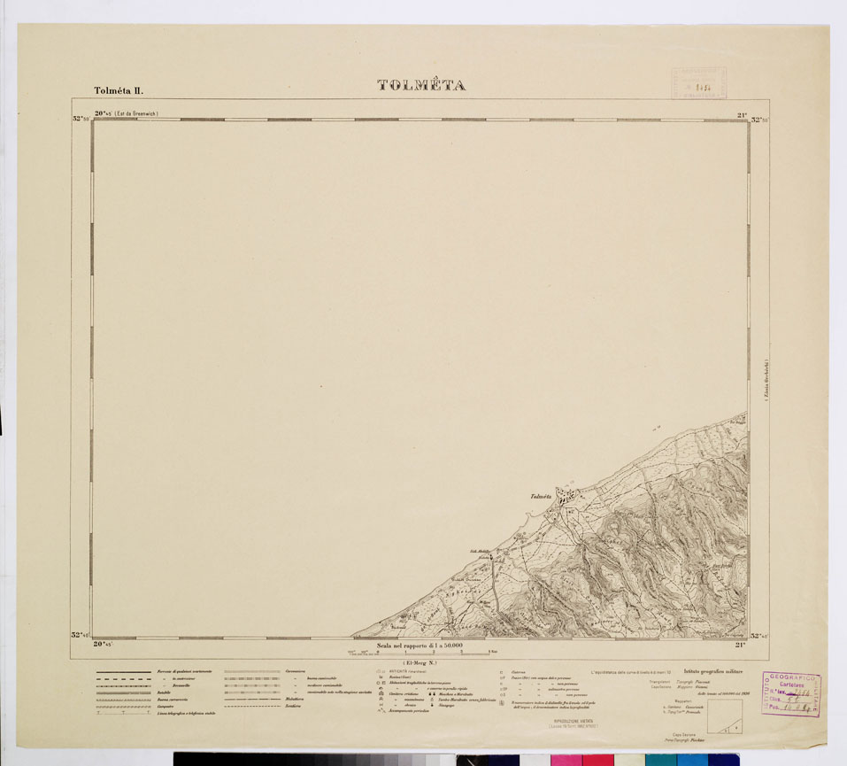 "I.G.M. Riprese nel 1919 le regolari operazioni di rilievo in Cirenaica, dopo l'interruzione del periodo bellico, servirono di punto di partenza, per i nuovi rilievi, le determinazioni astronomiche e geodetiche che già erano state eseguite fino dal 1912 a Bengasi e Derna dallo stesso I.G.M. Con le basi geodetiche già misurate in queste due località e una nuova misurata a es-Safsaf (sud-est di Cirene) si iniziava nel 1919 una nuova triangolazione alla quale si appoggiarono i nuovi lavori di rilievo. Le levate eseguite direttamente alla scala di 1:100.000 con procedimento grafico a mezzo della tavoletta pretoriana, adottando il sistema di proiezione naturale (come per le levate topografiche del Regno) in fogli di 30' di longitudine per 20' di latitudine, furono eseguite tenendo conto delle esigenze per un ingrandimento e un ridisegno al 50.000. La campagna topografica 1919-20 fruttava il rilievo di 6.000 kmq e nel 1921 vennero pubblicate 20 tavolette al 50.000 a cui si aggiunsero in seguito i tre quadranti (1923-24) del foglio di Bengasi. La zona rappresentata risulta quindi compresa tra Bengasi e Sidi Aon sulla costa e dal mare verso terra per una profondità di 40 km. La carta fu stampata in nero con l'adozione di speciali segni convenzionali rispondenti alle particolari condizioni della regione tenendo conto speciale della viabilità e della rete idrografica. Le forme del terreno sono rappresentate con curve di livello tracciate all'equidistanza di 10 metri. Questa carta dà una rappresentazione della Cirenaica ottima e porta un prezioso contributo alla morfologia della regione. Della carta furono pubblicate tre edizioni speciali a mostrare rispettivamente: 1) boschi e culture, 2) pozzi e cisterne, 3) i terreni (v. N° 17 d'ordine, N. 2685 d' inv.). La buona riduzione delle levate al 50.000 permise anche un ingrandimento al 25.000 in 60 fogli pure in nero (ved. N° 18 d'ordine, N. 4165 d' inventario). "