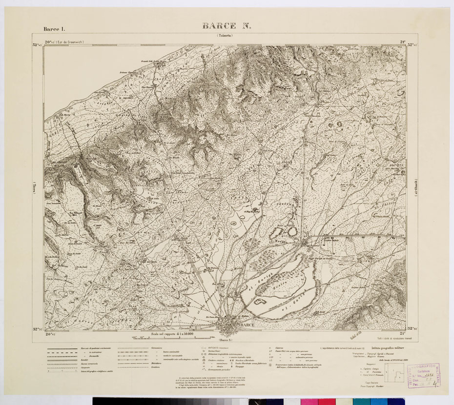 "I.G.M. Riprese nel 1919 le regolari operazioni di rilievo in Cirenaica, dopo l'interruzione del periodo bellico, servirono di punto di partenza, per i nuovi rilievi, le determinazioni astronomiche e geodetiche che già erano state eseguite fino dal 1912 a Bengasi e Derna dallo stesso I.G.M. Con le basi geodetiche già misurate in queste due località e una nuova misurata a es-Safsaf (sud-est di Cirene) si iniziava nel 1919 una nuova triangolazione alla quale si appoggiarono i nuovi lavori di rilievo. Le levate eseguite direttamente alla scala di 1:100.000 con procedimento grafico a mezzo della tavoletta pretoriana, adottando il sistema di proiezione naturale (come per le levate topografiche del Regno) in fogli di 30' di longitudine per 20' di latitudine, furono eseguite tenendo conto delle esigenze per un ingrandimento e un ridisegno al 50.000. La campagna topografica 1919-20 fruttava il rilievo di 6.000 kmq e nel 1921 vennero pubblicate 20 tavolette al 50.000 a cui si aggiunsero in seguito i tre quadranti (1923-24) del foglio di Bengasi. La zona rappresentata risulta quindi compresa tra Bengasi e Sidi Aon sulla costa e dal mare verso terra per una profondità di 40 km. La carta fu stampata in nero con l'adozione di speciali segni convenzionali rispondenti alle particolari condizioni della regione tenendo conto speciale della viabilità e della rete idrografica. Le forme del terreno sono rappresentate con curve di livello tracciate all'equidistanza di 10 metri. Questa carta dà una rappresentazione della Cirenaica ottima e porta un prezioso contributo alla morfologia della regione. Della carta furono pubblicate tre edizioni speciali a mostrare rispettivamente: 1) boschi e culture, 2) pozzi e cisterne, 3) i terreni (v. N° 17 d'ordine, N. 2685 d' inv.). La buona riduzione delle levate al 50.000 permise anche un ingrandimento al 25.000 in 60 fogli pure in nero (ved. N° 18 d'ordine, N. 4165 d' inventario). ."