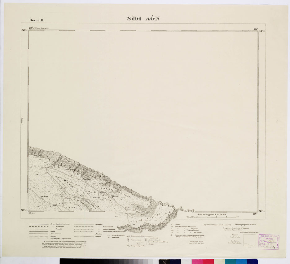 "I.G.M. Riprese nel 1919 le regolari operazioni di rilievo in Cirenaica, dopo l'interruzione del periodo bellico, servirono di punto di partenza, per i nuovi rilievi, le determinazioni astronomiche e geodetiche che già erano state eseguite fino dal 1912 a Bengasi e Derna dallo stesso I.G.M. Con le basi geodetiche già misurate in queste due località e una nuova misurata a es-Safsaf (sud-est di Cirene) si iniziava nel 1919 una nuova triangolazione alla quale si appoggiarono i nuovi lavori di rilievo. Le levate eseguite direttamente alla scala di 1:100.000 con procedimento grafico a mezzo della tavoletta pretoriana, adottando il sistema di proiezione naturale (come per le levate topografiche del Regno) in fogli di 30' di longitudine per 20' di latitudine, furono eseguite tenendo conto delle esigenze per un ingrandimento e un ridisegno al 50.000. La campagna topografica 1919-20 fruttava il rilievo di 6.000 kmq e nel 1921 vennero pubblicate 20 tavolette al 50.000 a cui si aggiunsero in seguito i tre quadranti (1923-24) del foglio di Bengasi. La zona rappresentata risulta quindi compresa tra Bengasi e Sidi Aon sulla costa e dal mare verso terra per una profondità di 40 km. La carta fu stampata in nero con l'adozione di speciali segni convenzionali rispondenti alle particolari condizioni della regione tenendo conto speciale della viabilità e della rete idrografica. Le forme del terreno sono rappresentate con curve di livello tracciate all'equidistanza di 10 metri. Questa carta dà una rappresentazione della Cirenaica ottima e porta un prezioso contributo alla morfologia della regione. Della carta furono pubblicate tre edizioni speciali a mostrare rispettivamente: 1) boschi e culture, 2) pozzi e cisterne, 3) i terreni (v. N° 17 d'ordine, N. 2685 d' inv.). La buona riduzione delle levate al 50.000 permise anche un ingrandimento al 25.000 in 60 fogli pure in nero (ved. N° 18 d'ordine, N. 4165 d' inventario). ."