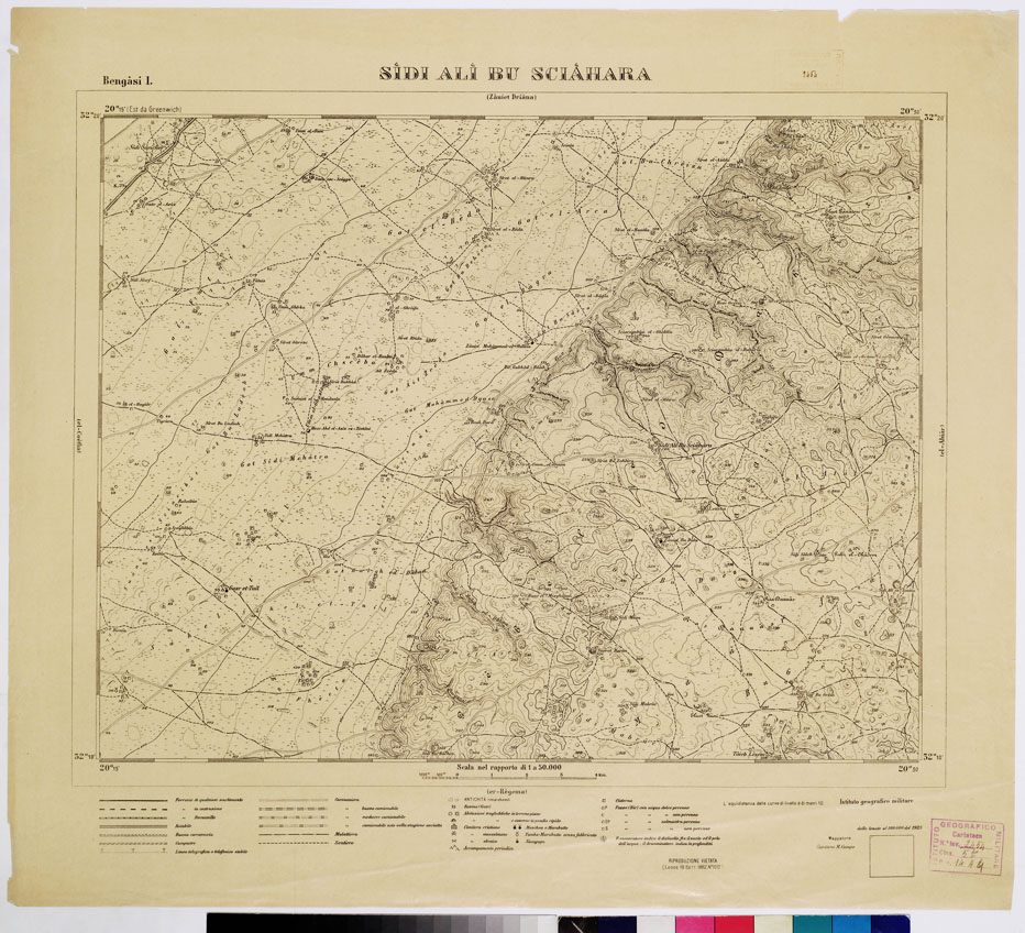 "I.G.M. Riprese nel 1919 le regolari operazioni di rilievo in Cirenaica, dopo l'interruzione del periodo bellico, servirono di punto di partenza, per i nuovi rilievi, le determinazioni astronomiche e geodetiche che già erano state eseguite fino dal 1912 a Bengasi e Derna dallo stesso I.G.M. Con le basi geodetiche già misurate in queste due località e una nuova misurata a es-Safsaf (sud-est di Cirene) si iniziava nel 1919 una nuova triangolazione alla quale si appoggiarono i nuovi lavori di rilievo. Le levate eseguite direttamente alla scala di 1:100.000 con procedimento grafico a mezzo della tavoletta pretoriana, adottando il sistema di proiezione naturale (come per le levate topografiche del Regno) in fogli di 30' di longitudine per 20' di latitudine, furono eseguite tenendo conto delle esigenze per un ingrandimento e un ridisegno al 50.000. La campagna topografica 1919-20 fruttava il rilievo di 6.000 kmq e nel 1921 vennero pubblicate 20 tavolette al 50.000 a cui si aggiunsero in seguito i tre quadranti (1923-24) del foglio di Bengasi. La zona rappresentata risulta quindi compresa tra Bengasi e Sidi Aon sulla costa e dal mare verso terra per una profondità di 40 km. La carta fu stampata in nero con l'adozione di speciali segni convenzionali rispondenti alle particolari condizioni della regione tenendo conto speciale della viabilità e della rete idrografica. Le forme del terreno sono rappresentate con curve di livello tracciate all'equidistanza di 10 metri. Questa carta dà una rappresentazione della Cirenaica ottima e porta un prezioso contributo alla morfologia della regione. Della carta furono pubblicate tre edizioni speciali a mostrare rispettivamente: 1) boschi e culture, 2) pozzi e cisterne, 3) i terreni (v. N° 17 d'ordine, N. 2685 d' inv.). La buona riduzione delle levate al 50.000 permise anche un ingrandimento al 25.000 in 60 fogli pure in nero (ved. N° 18 d'ordine, N. 4165 d' inventario). ."