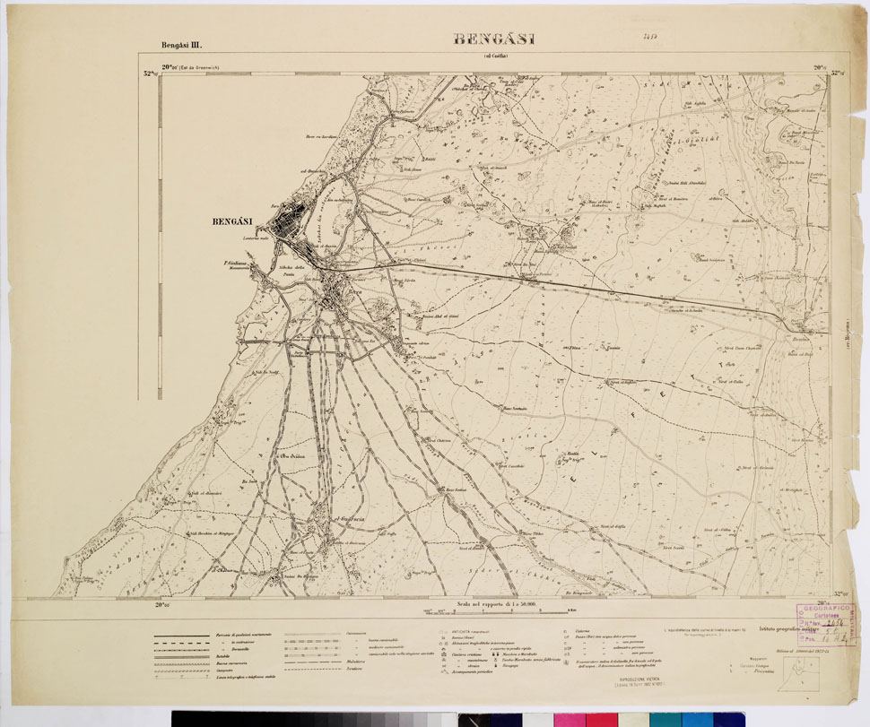 "I.G.M. Riprese nel 1919 le regolari operazioni di rilievo in Cirenaica, dopo l'interruzione del periodo bellico, servirono di punto di partenza, per i nuovi rilievi, le determinazioni astronomiche e geodetiche che già erano state eseguite fino dal 1912 a Bengasi e Derna dallo stesso I.G.M. Con le basi geodetiche già misurate in queste due località e una nuova misurata a es-Safsaf (sud-est di Cirene) si iniziava nel 1919 una nuova triangolazione alla quale si appoggiarono i nuovi lavori di rilievo. Le levate eseguite direttamente alla scala di 1:100.000 con procedimento grafico a mezzo della tavoletta pretoriana, adottando il sistema di proiezione naturale (come per le levate topografiche del Regno) in fogli di 30' di longitudine per 20' di latitudine, furono eseguite tenendo conto delle esigenze per un ingrandimento e un ridisegno al 50.000. La campagna topografica 1919-20 fruttava il rilievo di 6.000 kmq e nel 1921 vennero pubblicate 20 tavolette al 50.000 a cui si aggiunsero in seguito i tre quadranti (1923-24) del foglio di Bengasi. La zona rappresentata risulta quindi compresa tra Bengasi e Sidi Aon sulla costa e dal mare verso terra per una profondità di 40 km. La carta fu stampata in nero con l'adozione di speciali segni convenzionali rispondenti alle particolari condizioni della regione tenendo conto speciale della viabilità e della rete idrografica. Le forme del terreno sono rappresentate con curve di livello tracciate all'equidistanza di 10 metri. Questa carta dà una rappresentazione della Cirenaica ottima e porta un prezioso contributo alla morfologia della regione. Della carta furono pubblicate tre edizioni speciali a mostrare rispettivamente: 1) boschi e culture, 2) pozzi e cisterne, 3) i terreni (v. N° 17 d'ordine, N. 2685 d' inv.). La buona riduzione delle levate al 50.000 permise anche un ingrandimento al 25.000 in 60 fogli pure in nero (ved. N° 18 d'ordine, N. 4165 d' inventario). ."