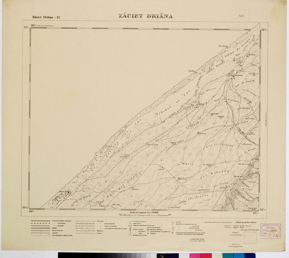 "I.G.M. Riprese nel 1919 le regolari operazioni di rilievo in Cirenaica, dopo l'interruzione del periodo bellico, servirono di punto di partenza, per i nuovi rilievi, le determinazioni astronomiche e geodetiche che già erano state eseguite fino dal 1912 a Bengasi e Derna dallo stesso I.G.M. Con le basi geodetiche già misurate in queste due località e una nuova misurata a es-Safsaf (sud-est di Cirene) si iniziava nel 1919 una nuova triangolazione alla quale si appoggiarono i nuovi lavori di rilievo. Le levate eseguite direttamente alla scala di 1:100.000 con procedimento grafico a mezzo della tavoletta pretoriana, adottando il sistema di proiezione naturale (come per le levate topografiche del Regno) in fogli di 30' di longitudine per 20' di latitudine, furono eseguite tenendo conto delle esigenze per un ingrandimento e un ridisegno al 50.000. La campagna topografica 1919-20 fruttava il rilievo di 6.000 kmq e nel 1921 vennero pubblicate 20 tavolette al 50.000 a cui si aggiunsero in seguito i tre quadranti (1923-24) del foglio di Bengasi. La zona rappresentata risulta quindi compresa tra Bengasi e Sidi Aon sulla costa e dal mare verso terra per una profondità di 40 km. La carta fu stampata in nero con l'adozione di speciali segni convenzionali rispondenti alle particolari condizioni della regione tenendo conto speciale della viabilità e della rete idrografica. Le forme del terreno sono rappresentate con curve di livello tracciate all'equidistanza di 10 metri. Questa carta dà una rappresentazione della Cirenaica ottima e porta un prezioso contributo alla morfologia della regione. Della carta furono pubblicate tre edizioni speciali a mostrare rispettivamente: 1) boschi e culture, 2) pozzi e cisterne, 3) i terreni (v. N° 17 d'ordine, N. 2685 d' inv.). La buona riduzione delle levate al 50.000 permise anche un ingrandimento al 25.000 in 60 fogli pure in nero (ved. N° 18 d'ordine, N. 4165 d' inventario). ."
