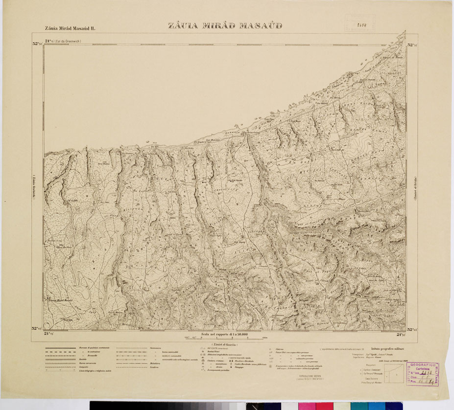 "I.G.M. Riprese nel 1919 le regolari operazioni di rilievo in Cirenaica, dopo l'interruzione del periodo bellico, servirono di punto di partenza, per i nuovi rilievi, le determinazioni astronomiche e geodetiche che già erano state eseguite fino dal 1912 a Bengasi e Derna dallo stesso I.G.M. Con le basi geodetiche già misurate in queste due località e una nuova misurata a es-Safsaf (sud-est di Cirene) si iniziava nel 1919 una nuova triangolazione alla quale si appoggiarono i nuovi lavori di rilievo. Le levate eseguite direttamente alla scala di 1:100.000 con procedimento grafico a mezzo della tavoletta pretoriana, adottando il sistema di proiezione naturale (come per le levate topografiche del Regno) in fogli di 30' di longitudine per 20' di latitudine, furono eseguite tenendo conto delle esigenze per un ingrandimento e un ridisegno al 50.000. La campagna topografica 1919-20 fruttava il rilievo di 6.000 kmq e nel 1921 vennero pubblicate 20 tavolette al 50.000 a cui si aggiunsero in seguito i tre quadranti (1923-24) del foglio di Bengasi. La zona rappresentata risulta quindi compresa tra Bengasi e Sidi Aon sulla costa e dal mare verso terra per una profondità di 40 km. La carta fu stampata in nero con l'adozione di speciali segni convenzionali rispondenti alle particolari condizioni della regione tenendo conto speciale della viabilità e della rete idrografica. Le forme del terreno sono rappresentate con curve di livello tracciate all'equidistanza di 10 metri. Questa carta dà una rappresentazione della Cirenaica ottima e porta un prezioso contributo alla morfologia della regione. Della carta furono pubblicate tre edizioni speciali a mostrare rispettivamente: 1) boschi e culture, 2) pozzi e cisterne, 3) i terreni (v. N° 17 d'ordine, N. 2685 d' inv.). La buona riduzione delle levate al 50.000 permise anche un ingrandimento al 25.000 in 60 fogli pure in nero (ved. N° 18 d'ordine, N. 4165 d' inventario). ."