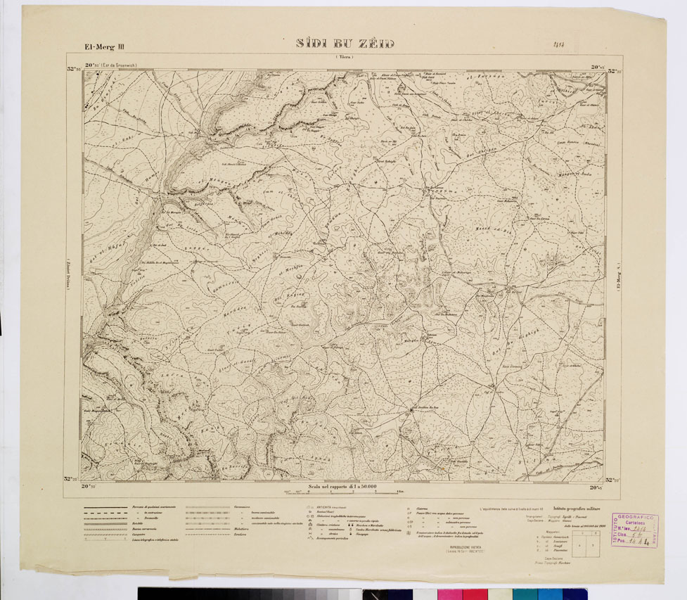 "I.G.M. Riprese nel 1919 le regolari operazioni di rilievo in Cirenaica, dopo l'interruzione del periodo bellico, servirono di punto di partenza, per i nuovi rilievi, le determinazioni astronomiche e geodetiche che già erano state eseguite fino dal 1912 a Bengasi e Derna dallo stesso I.G.M. Con le basi geodetiche già misurate in queste due località e una nuova misurata a es-Safsaf (sud-est di Cirene) si iniziava nel 1919 una nuova triangolazione alla quale si appoggiarono i nuovi lavori di rilievo. Le levate eseguite direttamente alla scala di 1:100.000 con procedimento grafico a mezzo della tavoletta pretoriana, adottando il sistema di proiezione naturale (come per le levate topografiche del Regno) in fogli di 30' di longitudine per 20' di latitudine, furono eseguite tenendo conto delle esigenze per un ingrandimento e un ridisegno al 50.000. La campagna topografica 1919-20 fruttava il rilievo di 6.000 kmq e nel 1921 vennero pubblicate 20 tavolette al 50.000 a cui si aggiunsero in seguito i tre quadranti (1923-24) del foglio di Bengasi. La zona rappresentata risulta quindi compresa tra Bengasi e Sidi Aon sulla costa e dal mare verso terra per una profondità di 40 km. La carta fu stampata in nero con l'adozione di speciali segni convenzionali rispondenti alle particolari condizioni della regione tenendo conto speciale della viabilità e della rete idrografica. Le forme del terreno sono rappresentate con curve di livello tracciate all'equidistanza di 10 metri. Questa carta dà una rappresentazione della Cirenaica ottima e porta un prezioso contributo alla morfologia della regione. Della carta furono pubblicate tre edizioni speciali a mostrare rispettivamente: 1) boschi e culture, 2) pozzi e cisterne, 3) i terreni (v. N° 17 d'ordine, N. 2685 d' inv.). La buona riduzione delle levate al 50.000 permise anche un ingrandimento al 25.000 in 60 fogli pure in nero (ved. N° 18 d'ordine, N. 4165 d' inventario). ."