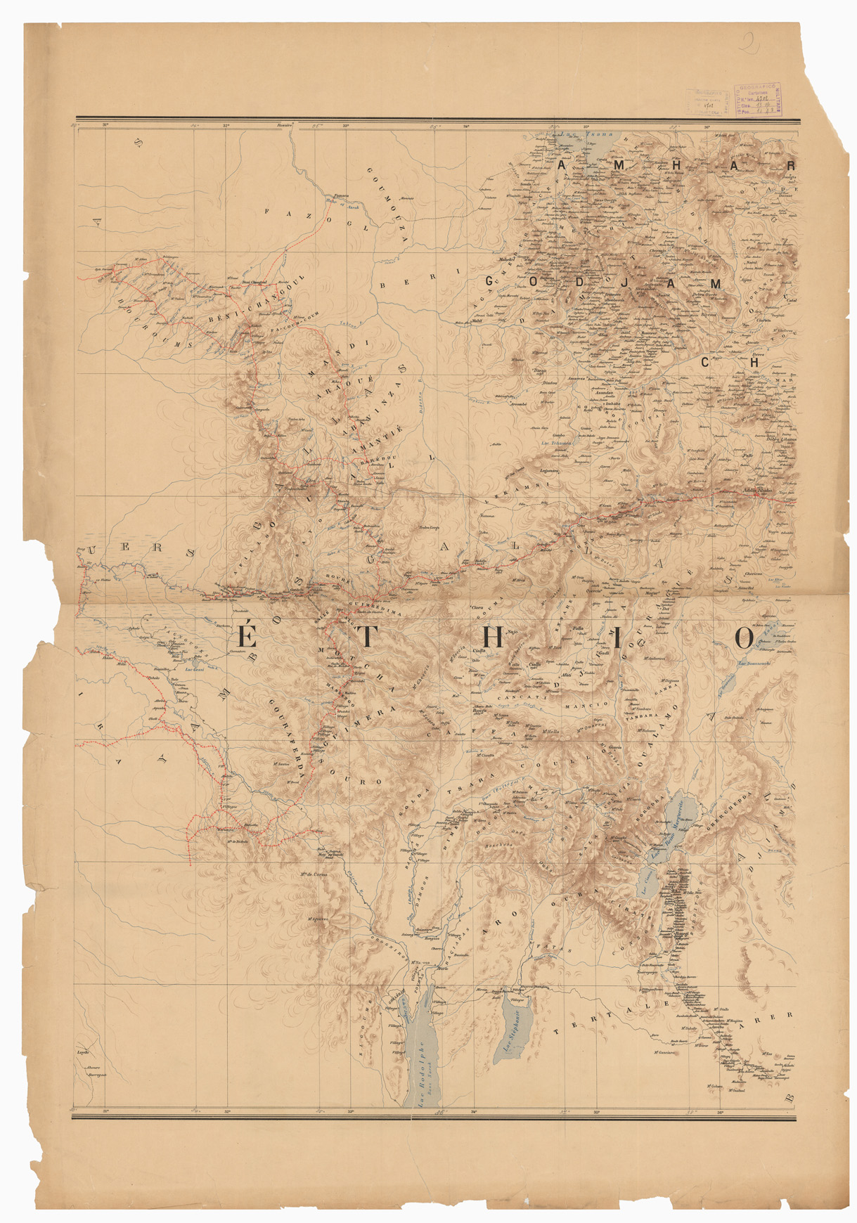 "CARTE PUBLIEE SOUS LES AUSPICES DE LA SOCIETE DE GEOGRAPHIE DE PARIS DRESSEE ET DESSINEE PAR LE COMMANDANT BARATIER D'APES LES TRAVAUX TOPOGRAPHIQUES ET ASTRONOMIQUES DE LA MISSION MARCHAND ET D'APRES LES ITINERAIRES DES OFFICIERS DU HAUT OUBANGUI, DE MR. FAIVRE (EXPEDON DU DEJAZ THESSAMA), DE LA MISSION DE BONCHAMP, DE LA MISSION BOTTEGO. ET DES ANCIENS VOYAGEURS. Rappresentazione orografica dimostrativa. Henry Barrère Editore Geografo. Incisori: F.lli Erhard."