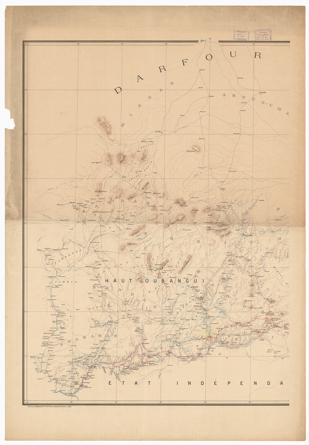 "CARTE PUBLIEE SOUS LES AUSPICES DE LA SOCIETE DE GEOGRAPHIE DE PARIS DRESSEE ET DESSINEE PAR LE COMMANDANT BARATIER D'APES LES TRAVAUX TOPOGRAPHIQUES ET ASTRONOMIQUES DE LA MISSION MARCHAND ET D'APRES LES ITINERAIRES DES OFFICIERS DU HAUT OUBANGUI, DE MR. FAIVRE (EXPEDON DU DEJAZ THESSAMA), DE LA MISSION DE BONCHAMP, DE LA MISSION BOTTEGO. ET DES ANCIENS VOYAGEURS. Rappresentazione orografica dimostrativa. Henry Barrère Editore Geografo. Incisori: F.lli Erhard."