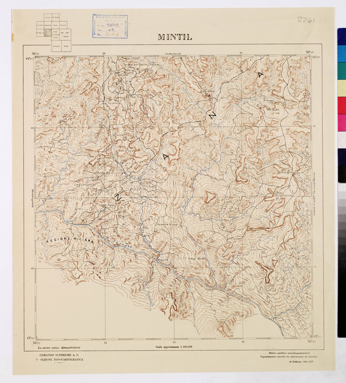 "Rappresentazione orografica a curve dimostrative. Rilievo speditivo aereofotogrammetrico, toponomastica raccolta da informazioni ed itinerari. Comando Superiore A. O. 7^ Sezione Topocartografica."